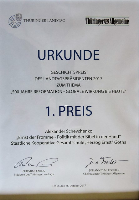 Einen großen Erfolg errang Alexander Schevchenko mit seiner Seminarfacharbeit "Herzog Ernst der Fromme - Politik mit der Bibel in der Hand" beim dritten Geschichtswettbewerb des Thüringer Landtagspräsidenten zum Thema "500 Jahre Reformation".