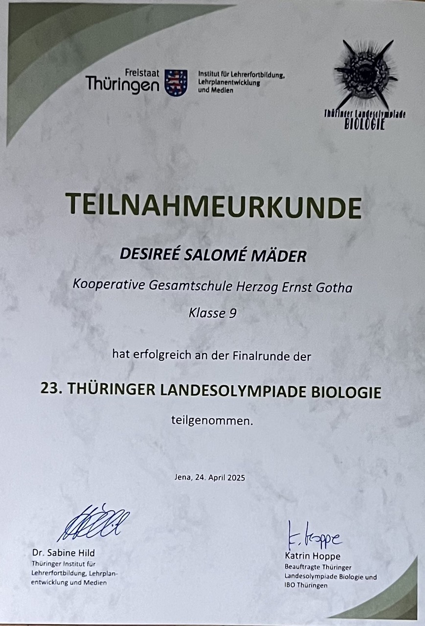 Desirée Mäder aus der Klasse 9c war eine von ihnen und hat als einzige Schülerin aus Gotha die KGS Gotha würdig vertreten. Wir gratulieren Desirée zu diesem Erfolg und würden uns freuen, auch im nächsten Schuljahr biologisch interessierte Schüler unserer Schule bei der Teilnahme an der Landesolympiade Biologie begleiten zu können.