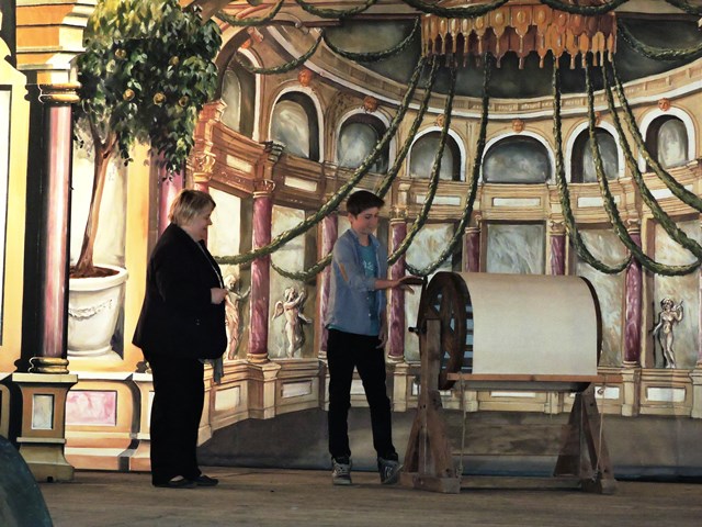 Mit einem freundlichen Schmunzeln betrachteten am vergangenen Mittwoch zahlreiche Gäste das lebhafte Geschehen auf Schloss Friedenstein. Mit viel Herz und Begeisterungsvermögen nahmen die Museumspädagoginnen Heike Faber-Günther und Gabriele Roth die Schülerinnen und Schüler der Klasse 7d der KGS Herzog Ernst mit auf eine Reise in die Zeit des Barock. Den Auftakt bildete der Besuch des Ekhoftheaters. Unter fachkundiger Anleitung von Heike Faber- Günther demonstrierte Aaron Jarosch auf der Bühne seinen Mitschülern im Zuschauerraum, was es heißt, „aus der Versenkung zu kommen“, „ins Rampenlicht zu treten“ und „Lampenfieber zu haben“. Robert Sommer erzeugte mit einer Theatermaschine Windgeräusche, während im Hintergrund mit Holzkugeln grollender Donner imitiert wurde. Die Schüler konnten einen Blick auf die Wellbäume und Umlenkrollen in der Unterbühne werfen und erlebten die Rezitation verschiedener Fassungen des Erlkönigs durch Emma Kurths und Javier Beato- Campano von den „Brettern, die die Welt bedeuten“.
