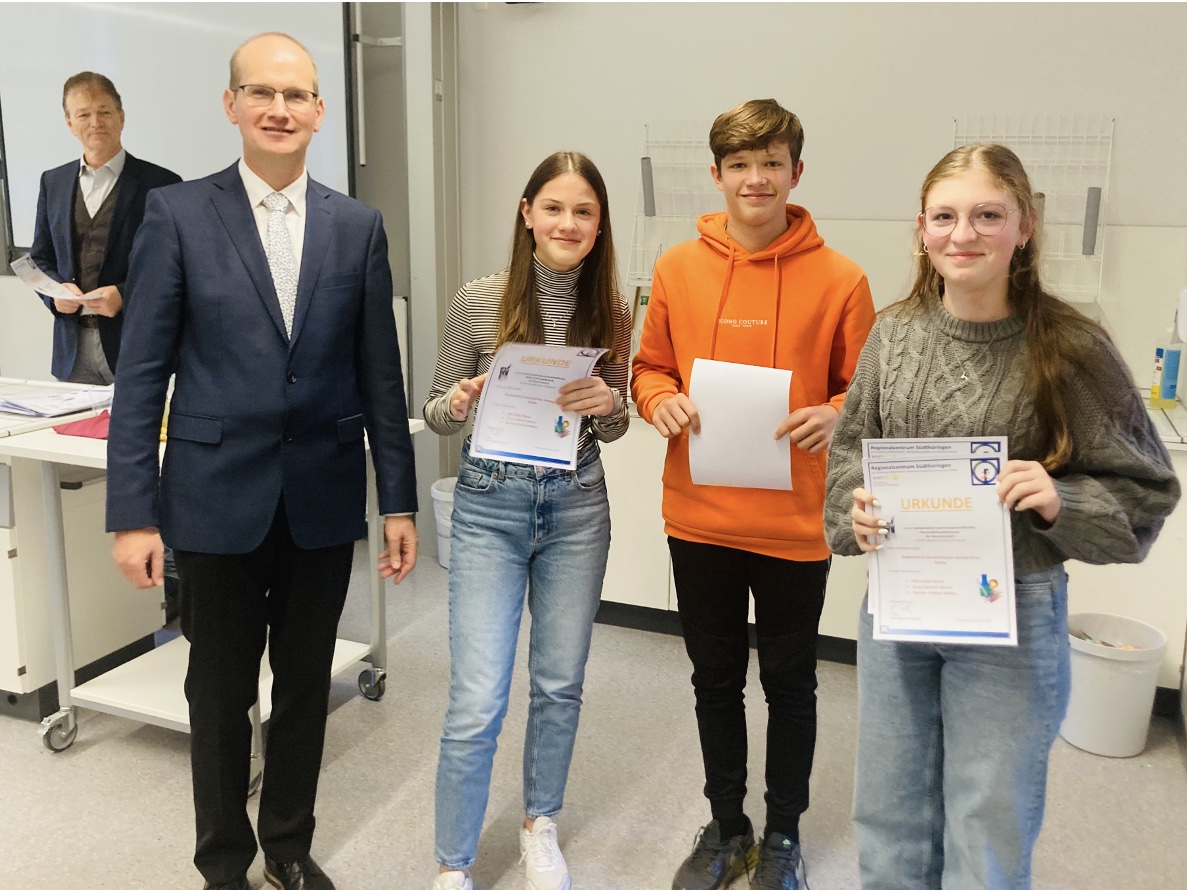 Am 23.11. trafen sich Schülerinnen und Schüler der achten Jahrgangsstufe aus dem Süd- und Westthüringer Raum, um am siebten mathematisch-naturwissenschaftlichen Mannschafts-wettbewerb an der Goetheschule Ilmenau teilzunehmen. Die KGS wurde in diesem Jahr durch Desirée Mäder (8c), Alia Bauer (8e) und Linus Karsch (8d) vertreten. Bevor die Schülerteams ihre mathematisch-naturwissenschaftlichen Kenntnisse unter Beweis stellen konnten, stellten Schüler der Goetheschule Vorträge zum diesjährigen Thema „Systeme, Systematik und Wechsel-beziehungen“ aus den Bereichen Mathematik, Physik, Biologie und Chemie vor. Die waren, so sind sich Desirée, Alia und Linus einig, sehr interessant. Die Begeisterung für mathematisch-naturwissenschaftliche Inhalte war an diesem Tag allen Teilnehmern der 13 teilnehmenden Schulen anzumerken. Wir bedanken uns für diesen sehr gut organisierten Veranstaltungstag voller Naturwissenschaften und gratulieren Desirée, Alia und Linus recht herzlich für ihre erfolgreiche Teilnahme.