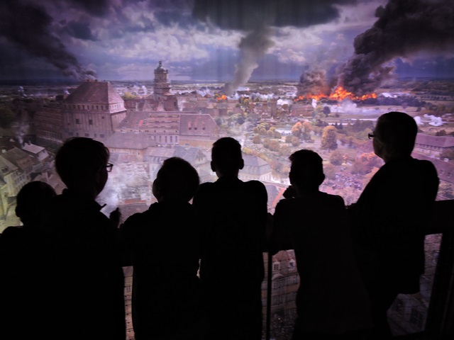 „Gut, dass wir nicht wirklich wissen, was Krieg ist!“, sagte Anna Göring mit Blick auf das Bild des brennenden Leipzig. Gemeinsam mit Mitschülern des 8. Jahrgangs der KGS Herzog Ernst Gotha besuchte sie das Panoramabild „Leipzig 1813“ von Yadegar Asisi im Panometer der sächsischen Stadt. Ihr Klassenlehrer hatte die Eintrittskarten dafür bei einem Preisausschreiben des Klett- Verlages gewonnen. Nun blickten die 30 mitgefahrenen Gesamtschüler aus dem Regelschul- und aus dem Gymnasialzweig auf eine 3500m² (!) große Bildfläche, die die schrecklichen Ereignisse der Tage vom 16. bis 19. Oktober 1813 darstellte, als bei der Stadt 500.000 Soldaten aufeinanderstießen. Verstärkt wurden die bedrückenden Eindrücke durch Bild- und Toneffekte. Zusätzliche Informationen erhielten die Schüler bei einer vorangegangenen Führung durch Nadine Landscheibe und Friedemann Huse.