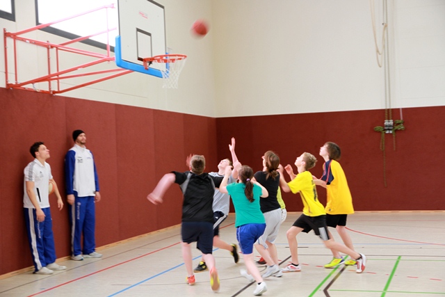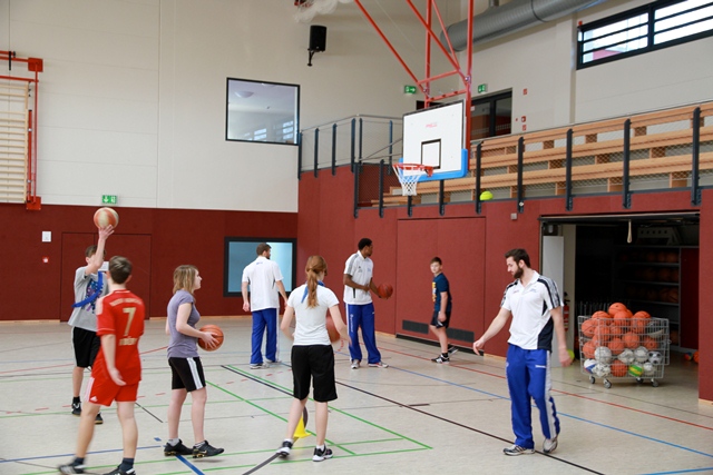 15 Schüler und Schülerinnen der 8. Klassen entschieden sich dafür und lernten in diesen 5 Tagen verschiedene Seiten dieses Sports kennen. Bereits am Montag kamen die Profispieler der Rockets und arbeiteten mit den Schülern an unterschiedlichen Schwerpunkten. So standen Wurf, Pass, Doppelpass, Dribbling und Rebound auf dem Programm. Vor allem an der Reboundstation ging es heiß her. Hier gab es die ersten kleineren Blessuren. So erlebten alle, wie hart der Kampf um den Ball unter den Körben ist.