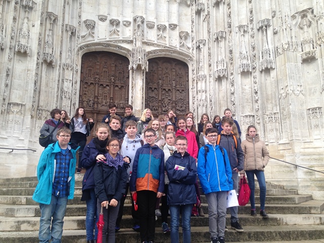 Seit nunmehr 3 Jahren unterhält unsere Schule Briefkontakte zum Collège “Institution Notre Dame“in Beauvais. Begonnen hat alles mit einem 4-wöchigen Schüleraustausch von Lauren Paslat und Florian Rohde aus der 10c vor drei Jahren. Danach wechselten Briefe, Bilder und Karten beide Schulen und es entstanden erste Freundschaften. Im Frühjahr 2017 kam plötzlich eine Einladung nach Beauvais (nördlich von Paris). Und so erlebten 19 Schüler und Schülerinnen der 6. Bis 8.Klasse mit ihren Lehrerinnen Frau Haude und Frau Möller den Schulalltag an der Institution Notre Dame, lernten in einer Stadtrallye die Stadt Beauvais und die Hauptstadt der Region Amiens kennen. Auch das Schloss Chantilly mit seiner Ausstellung war sehr beeindruckend. Untergebracht waren wir in den Gastfamilien, so dass man den französischen Alltag hautnah miterleben konnte. Bei gemeinsamen Projekten, Liedern und Spielen entstanden schnell neue und vertieften sich bestehende Freundschaften. Die Gastfreundschaft der französischen Familien war beispiellos und so gab es manche Träne beim Abschied. Umso mehr freuen wir uns auf ein Wiedersehen, erlebnisreiche und hoffentlich sprachfördernde Projekte zwischen den Austauschschülern.