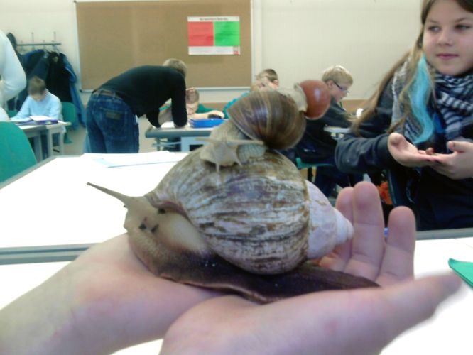 Dass man die Tiere sehen und anfassen kann, finde ich sehr gut, da man so besser zuhört und dadurch mehr lernt. Am besten hat mir bis jetzt die Achatschnecke gefallen, weil ich noch nie so eine große Schnecke gesehen hatte.
