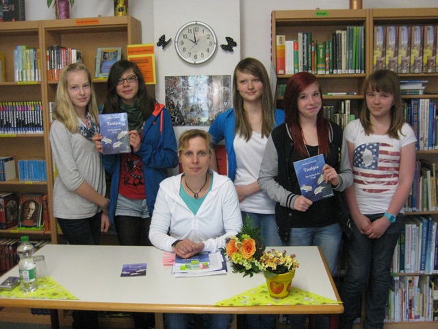 Frau Brommer hatte die Autorin Kathlen Schmidt für uns eingeladen, die uns den ersten Band ihrer Trilogie „Tonhjea – Die Kolonie der Tiefe“ vorstellte. In dem Jugendbuch geht es um die 18jährige Tonhjea, die nach dem bestandenen Abitur in einem Feriencamp arbeitet, um sich etwas Taschengeld zu verdienen. Als sie drei Mädchen das Leben rettet, wird sie erbarmungslos in die Tiefe gezogen. Es beginnt für Tonhjea eine ungewöhnliche und abenteuerliche Reise tief unten im Meer…