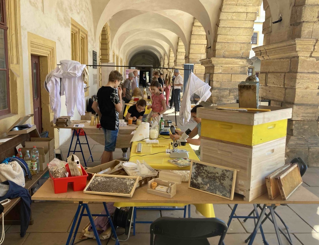 Am 08. Juni hielten Bienen Einzug auf Schloss Friedenstein. Unter den Arkaden des Schlosses präsentierten Johanna König, Sarah Krivna, Lynn Reibstein und Jason Seifahrt die Imker-AG unserer Schule. Interessierte Besucher konnten hier u. a. frischen Honig verkosten, Kerzen drehen oder Lippenbalsam herstellen. Unterstützt wurde der Bienentag durch die Stiftung Thüringer Schlösser und Gärten. Im Rahmen der „Langen Tage der Natur“ möchten der NABU Thüringen und die Stiftung Naturschutz auf die biologische Vielfalt im Freistaat aufmerksam machen und für die kostbaren Naturschätze im Land begeisternt