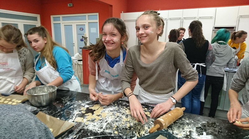 Bei VIBA in Erfurt lernten die 38 Jugendlichen sowie die französischen Begleiterinnen Pralinen herzustellen, im Marquardt Küchenstudio Emleben probierten sie unter Anleitung deutsche Plätzchenrezepte aus. Des Weiteren testeten sie die kulinarische Vielfalt der Weihnachtsmärkte.
