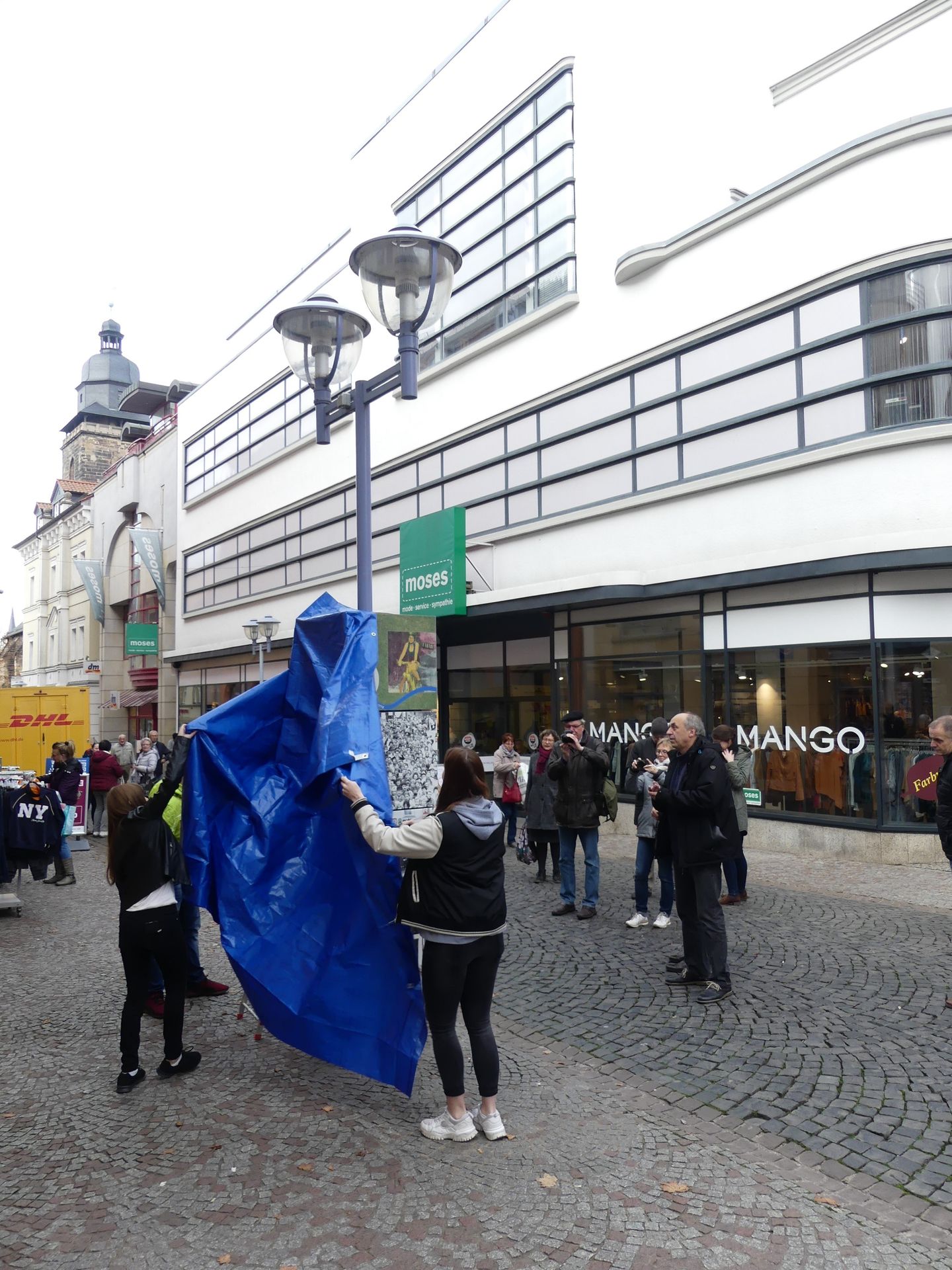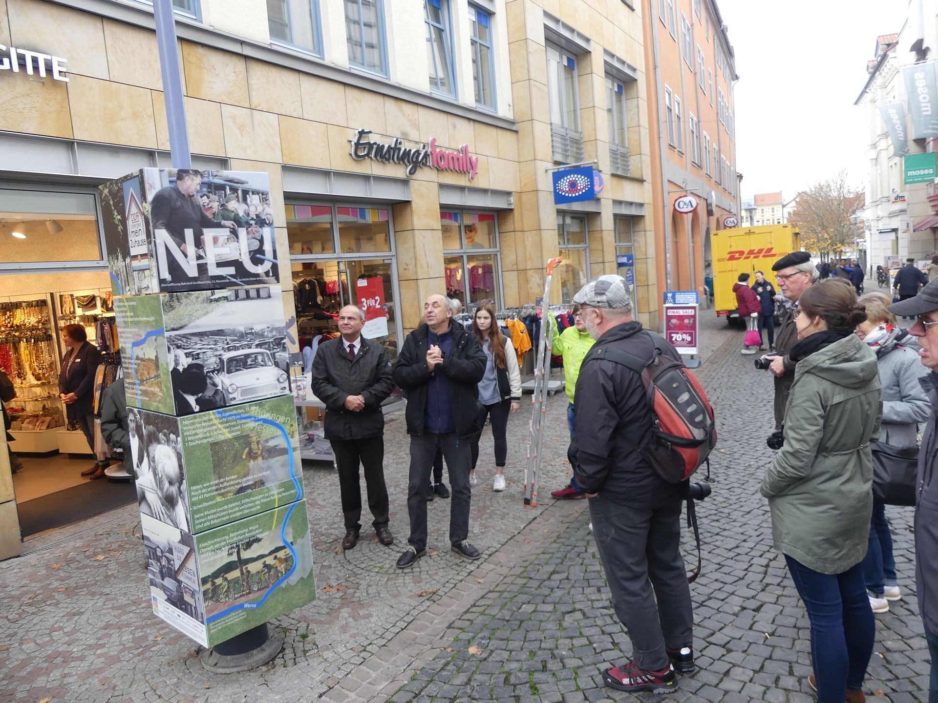 Wie bereits angekündigt, wurden am Mittwoch, dem 6. November, die vier Würfelsäulen des in der Überschrift genannten Projekts eingeweiht. Zusammen mit OB Knut Kreuch wurde die Ausstellung durch ihren Initiator, den Berliner Autoren und Journalisten Hans Ferenz, eröffnet. Der Aufbau war bereits einen Tag zuvor unter fleißiger Mithilfe von Schülern aus der 10e erfolgt. Bei der Entfernung der Hüllen halfen Paul, Angelina, Jessy und Amy aus der 10c. Die Säulen erinnern an die Wende in der DDR vor 30 Jahren und tragen - beginnend am Neumarkt Richtung Erfurter Straße - die Schwerpunktthemen Macht, Alltag, Aufbruch und Neuland. Zu sehen sind Bilder, man kann mit QR-Codes Zusatzinformationen erhalten und auch in eine Säule Einblick in frühere Zeiten nehmen. Viel Spaß beim Entdecken und Nachdenken!