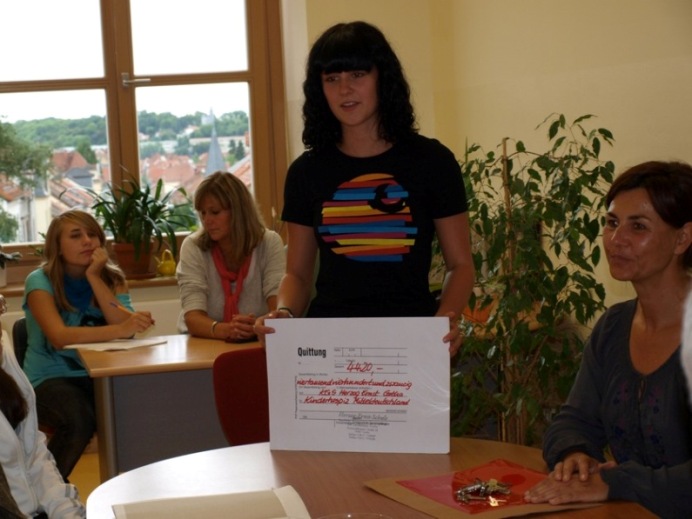 Am Montag den 16.08.2010 wurde die Spende des Laufes “Kinder laufen für Kinder“ an die stellvertretende Vorsitzende des Fördervereins des Kinderhospiz Mitteldeutschland übergeben. An dieser Veranstaltung nahmen Frau Krause, Frau Kruspe, die leitende Lehrerin Frau Dr. Löhr und die Schülervertreter Michelle Neuber und Anna-Marie Grübel aus der Klasse 10e teil. Bei diesem Lauf wurden insgesamt 8840 € eingenommen, die von über 500 Schülern der Klassen 5-7 aus der KGS Gotha erlaufen wurden. Von diesem Geld gingen 50% an das Kinderhospiz, 20% an den Förderverein unserer Schule und weitere 30% an die einzelnen Klassenkassen.