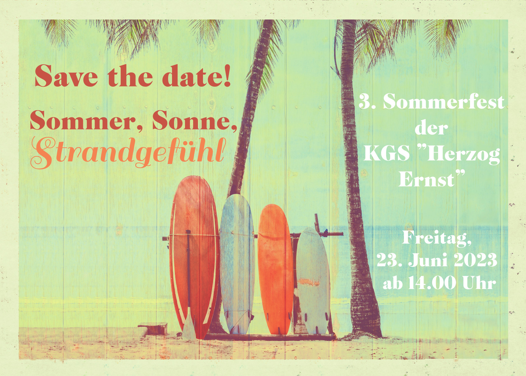 Unter dem Motto „Sommer, Sonne, Strandgefühl“ wollen die Schüler, die Lehrer und die Schülervertretung das aktuelle Schuljahr ausklingen lassen. Außerdem findet die „Staffelübergabe“ von unserer alten zur neuen Schulleitung statt.