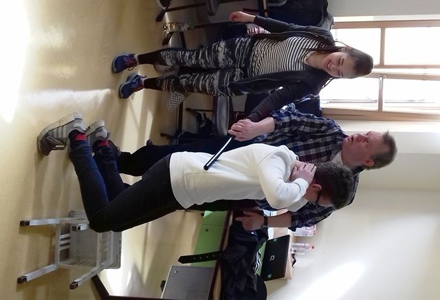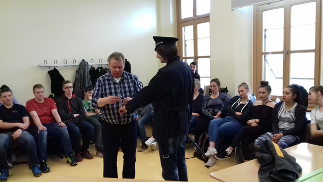 Besonders eindrucksvoll war für die Schüler auch die Anschaulichkeit des Vortrages. Originalutensilien wie eine Knebelfessel, ein Gummiknüppel oder Uniformteile ließen manches nacherlebbarer werden. „Eine Uniform gibt Macht.“, sagte Norbert Wagner. Jonas Schottmann, der in eine solche schlüpfte, bestätigte dieses Gefühl nach dem Rollenspiel eines Verhörs. „Macht verändert aber auch den Menschen.“, warnte der Zeitzeuge. „Es kommt auf die Menschen an, wie sie sich verhalten.“ Warum er seine Erfahrungen an Schulen weitergäbe, wollte Niklas Stötzer wissen.