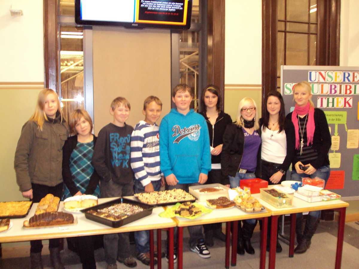 „Kuchen mampfen für einen guten Zweck“ - hieß es am Mittwoch, dem 17.11.2010. Chelsea Bessert, Stefanie Hannig, Melanie Meier und Lisa Zeihs organisierten zusammen mit den Schülern der Klasse 6d einen Kuchenbasar zu Gunsten unseres Patenkindes Bethelhem Wagari Terfa. Es wurden Plakate gebastelt, Kuchen gebacken, dieser wurde dann verkauft und zu guter Letzt wurde wieder Ordnung geschaffen, um Ärger mit den Hausmeistern aus dem Weg zu gehen. Diese haben die Aktion unterstützt und dafür einen Teller Kuchen als Dankeschön bekommen. Unterstützung kam außerdem von zahlreichen Schülern und Lehrern.