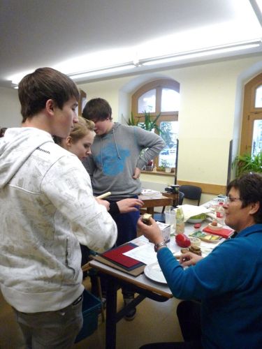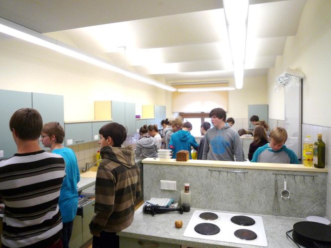 Am Freitag, den 7. Dezember 2012, war für die Schülerinnen und Schüler der 8d der Kooperativen Gesamtschule „Herzog Ernst“ in Gotha kein normaler Unterrichtstag. „Gesunde Ernährung“ war das Thema des Projekttages. Mit freundlicher Unterstützung von Frau Reingard Kneise, wurde die „Gesunde Ernährung“ unter die Lupe genommen. Die Mädchen und Jungen befassten sich die ersten Stunden mit der Ernährungspyramide. Welche Lebensmittel gesund sind, welche man in Maßen und welche man in Massen essen sollte. Im weiteren Verlauf des Projektes mit der Bezeichnung „Lila Kuh und Anti-Matsch-Tomate“ vom Thüringer Ökoherz, fanden sich alle in der schuleigenen Küche ein. Hier wurde mit viel Spaß und Freude Knäckebrot und andere gesund Leckerein gebacken. Der selbstgemachte Brotaufstrich, egal ob süß oder herzhaft, durfte natürlich nicht fehlen. Für die Klasse 8d war es ein sehr informativer Vormittag, wobei der ein oder andere gewisse Anregungen mit nach Hause genommen hat.
