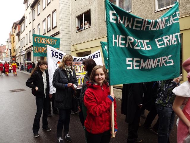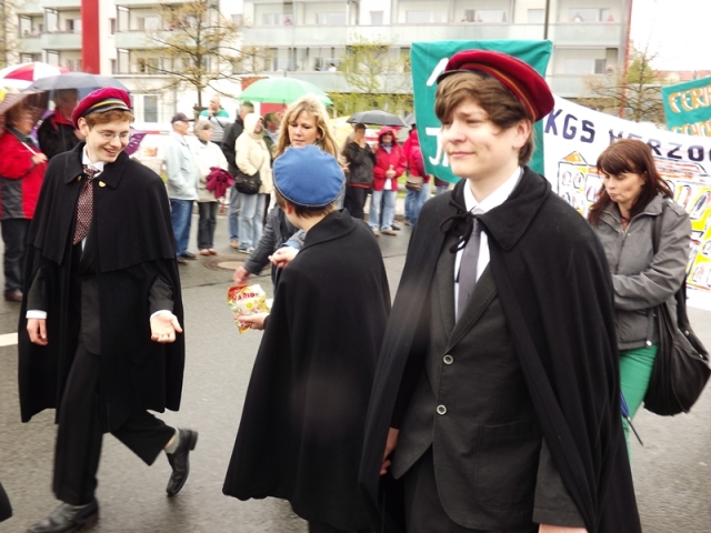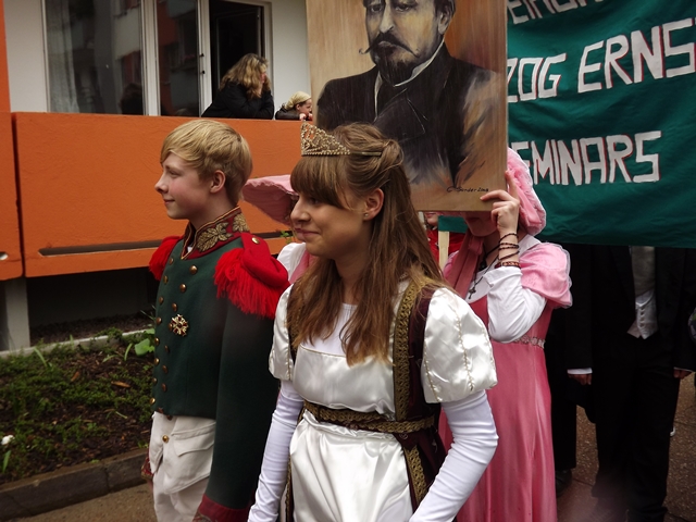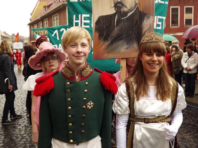 125 Jahre besteht unsere Schule nun schon. Das war auch das Thema für unser Bild beim Gothardusumzug. Der Herzog nebst Gemahlin, Zofen und Studenten gaben sich die Ehre. Ihnen wurde vom Gothaer Volk entsprechend gehuldigt. Irgendwie sieht unser Herzogpaar auch besser aus als die echte Vorlage. Dirk Becher