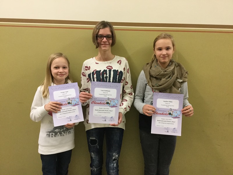 Wir gratulieren Luise Hoffmann (6d), Angelina Müller (6e) und Svenja Vogel (6e) für die sehr erfolgreiche Teilnahme am Experimentalwettbewerb Chemkids 2015.