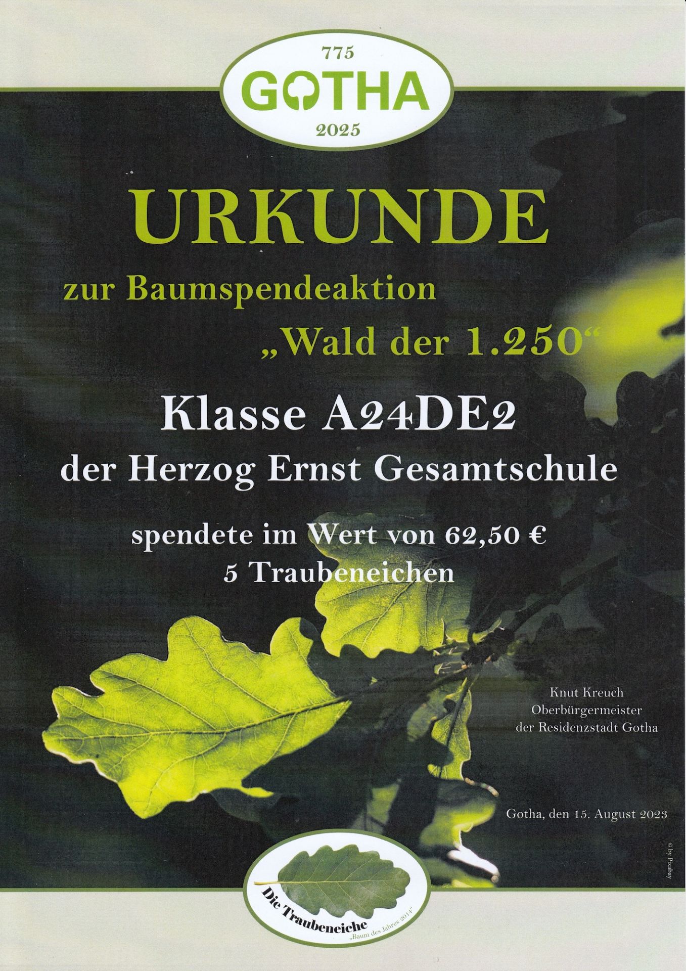 Der Wald schlägt in den letzten Jahren Alarm. Schäden sind an vielen Stellen zu sehen. Deshalb beteiligten sich die Kurse des Jahrgangs A24 am Baumspendenprojekt „Wald der 1.250“. Dieses wurde von der Stadt Gotha initiiert. Anlass dafür war das 2025 anstehende Jubiläum ihrer Ersterwähnung. Mit dem Erlös der Aktion werden in einem Waldstück am Boxberg Ende dieses Jahres auf einer Fläche von 2.500m² 1.250 Bäume gepflanzt, um einen kleinen Eichenwald entstehen zu lassen. Dann besteht auch die Möglichkeit, selbst mit bei der Wiederaufforstung anzupacken.