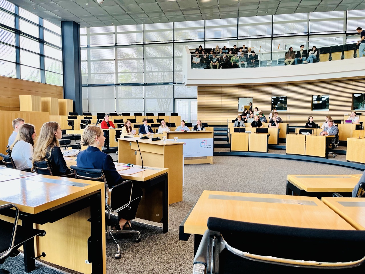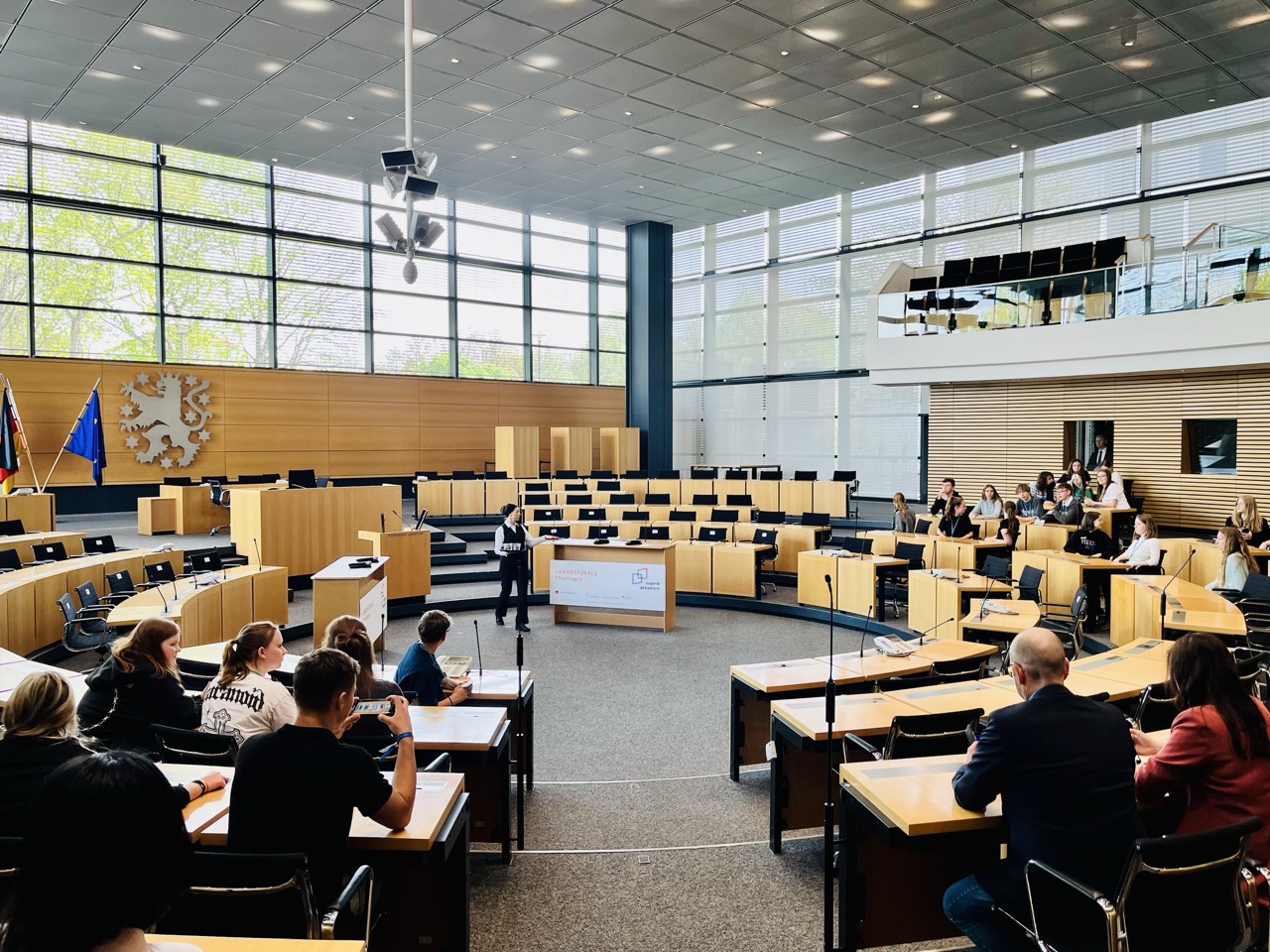 Im Plenarsaal des Thüringer Landtages verfolgten die Schülerinnen und Schüler der Arbeitsgemeinschaft „Jugend debattiert“ die Finaldebatten der besten jungen Rednerinnen und Redner Thüringens. Unter den wachsamen Augen des neuen Kultusministers Christian Tischner sowie des Landtagspräsidenten Dr. Thadäus König, der als Hausherr ebenfalls anwesend war, stellten sich die Finalistinnen und Finalisten den anspruchsvollen Fragestellungen: Sollte es eine generelle Pflicht zum Blutspenden geben? Und: Sollten die Radio- und Fernsehangebote des öffentlich-rechtlichen Rundfunks reduziert werden?