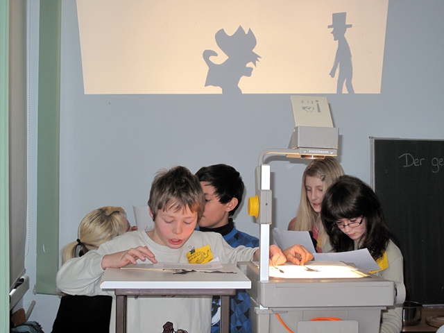 Anschließend hörten alle die Vorlesung zum Thema „Märchen wandern um die Welt“. Nach einer kurzen Pause ging’s ins Seminar. Die Klasse 5d bearbeitete nach einer Einweisung das Märchen „Der gestiefelte Kater“ und die 5e „Hänsel und Gretel“. In Gruppen wurden einzelne Szenen dieser Märchen mit Schattenspielfiguren eingeübt und im Anschluss präsentiert.