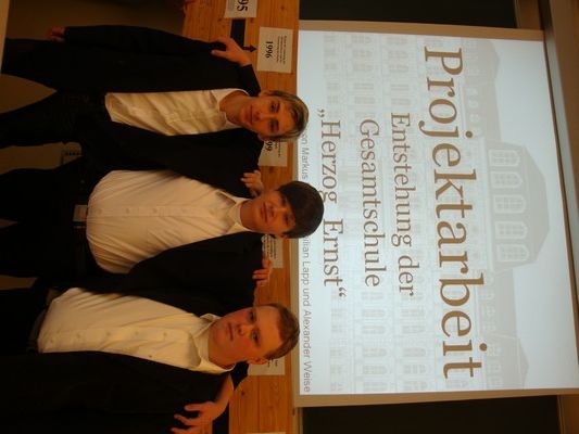„So eine tolle Präsentation habe ich in einer Projektarbeitsprüfung noch nicht erlebt!“, lobte Klassenlehrerin Diana Biber ihre Prüflinge Markus Kroll, Maximilian Lapp und Alexander Weise aus der 10b der KGS Herzog Ernst. Die drei jungen Männer hatten sich mit Geschichte und Gegenwart ihrer Schule beschäftigt, die Renovierung und Modernisierung in den letzten Jahre dokumentiert, den Schultyp in die deutsche Bildungslandschaft eingeordnet und unter den Mitschülern Stärken der Schule und Verbesserungsmöglichkeiten erfragt und klopften sich nun gegenseitig stolz auf die Schultern.