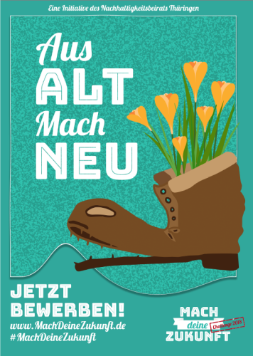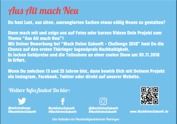 Aufgefordert sind Thüringer Schülerinnen und Schüler sowie junge Erwachsene (im Alter zw. 13 u. max. 25 Jahren), sich mit einem „Aus Alt mach Neu“-Projekt zu bewerben. Gemeint sind Projekte, bei denen aus Altmaterialien, die eigentlich schon für die Entsorgung gedacht waren, etwas Neues entstanden ist.