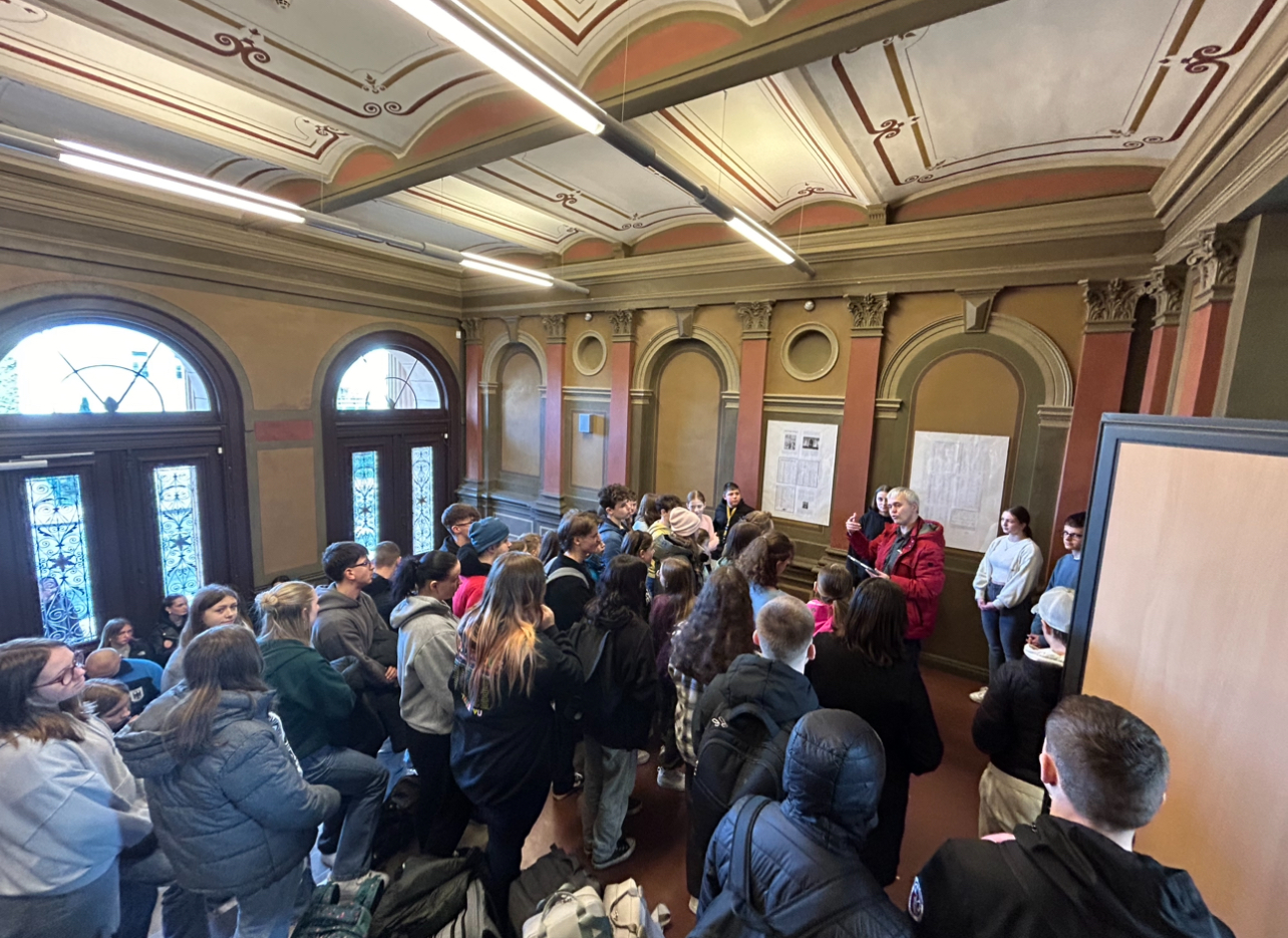 Die Schülergruppe hatte sich im Seminarfach mit dem Umgang im Gedenken an die Kriegstoten der einstigen Bildungseinrichtungen in ihrem Schulgebäude beschäftigt. Florian berichtete, dass, befeuert von Direktor Georg Witzmann, insgesamt drei Lehrer und 158 ehemalige sowie aktive Schüler des Herzoglichen Lehrerseminars zumeist freiwillig in den Ersten Weltkrieg zogen. Jeder zweite kehrte nicht zurück – alle drei Pädagogen und 80 Schüler fielen. 1922, während der Weimarer Republik, wurden auf Initiative Witzmanns im Foyer der nun entstandenen Deutschen Aufbauschule Tafeln mit den Namen der Gefallenen angebracht, um das Gedenken an die Toten zu bewahren.