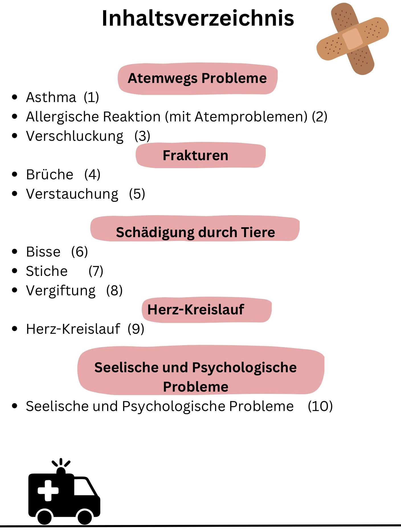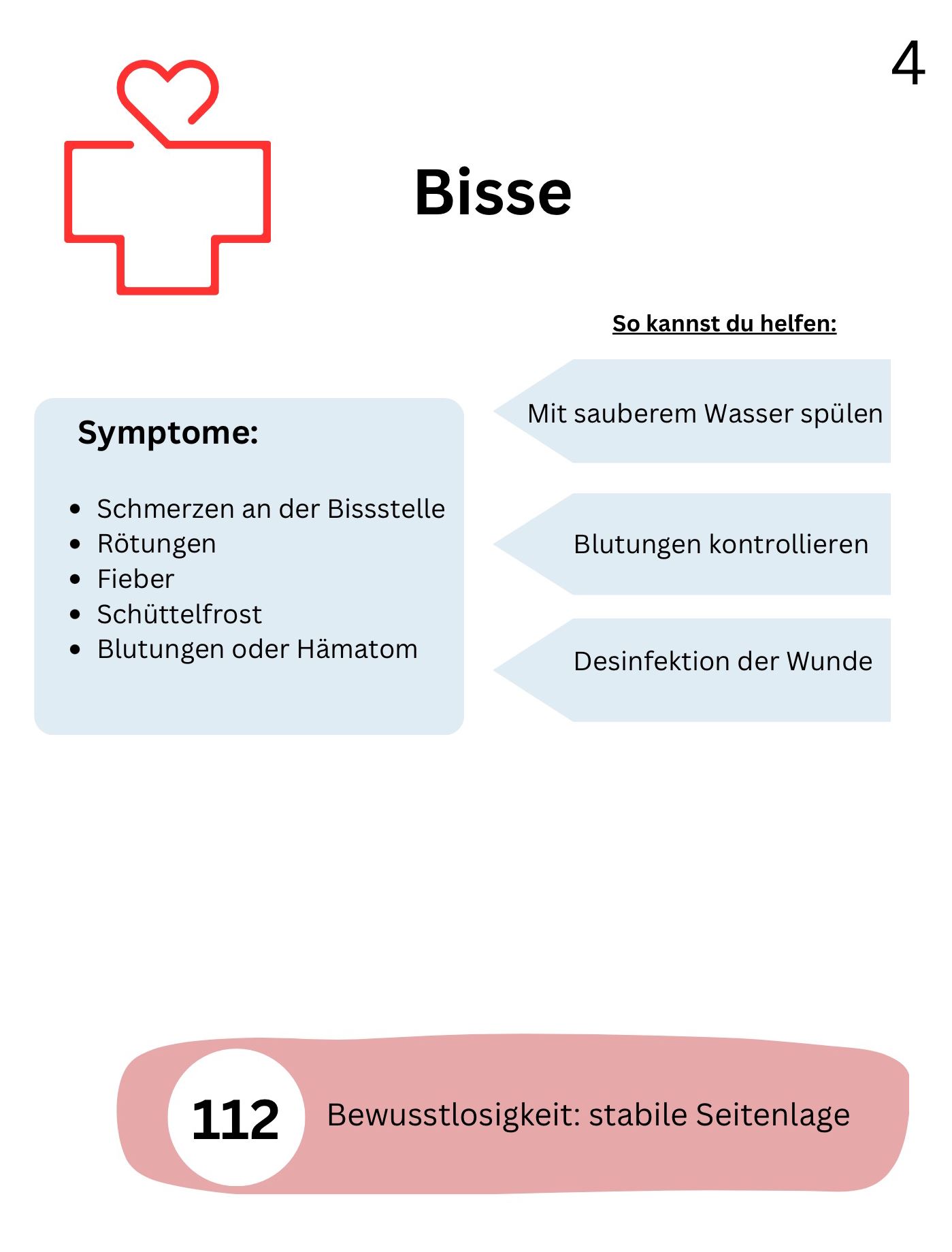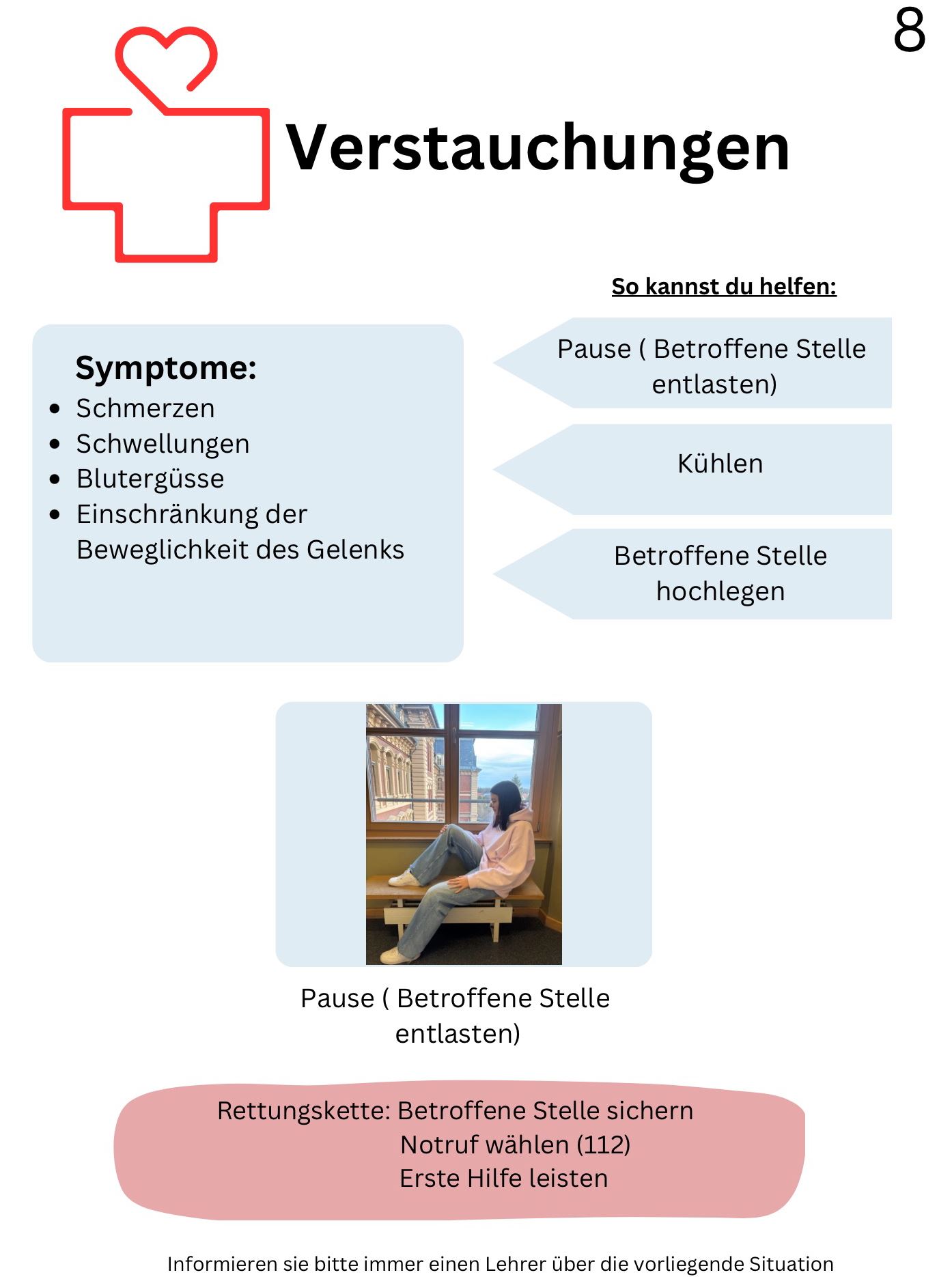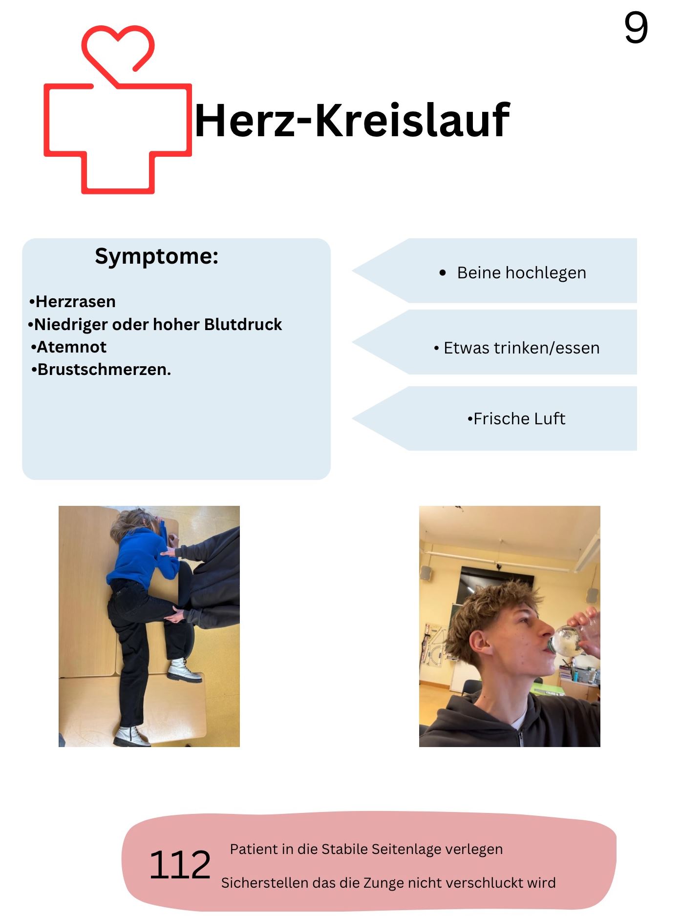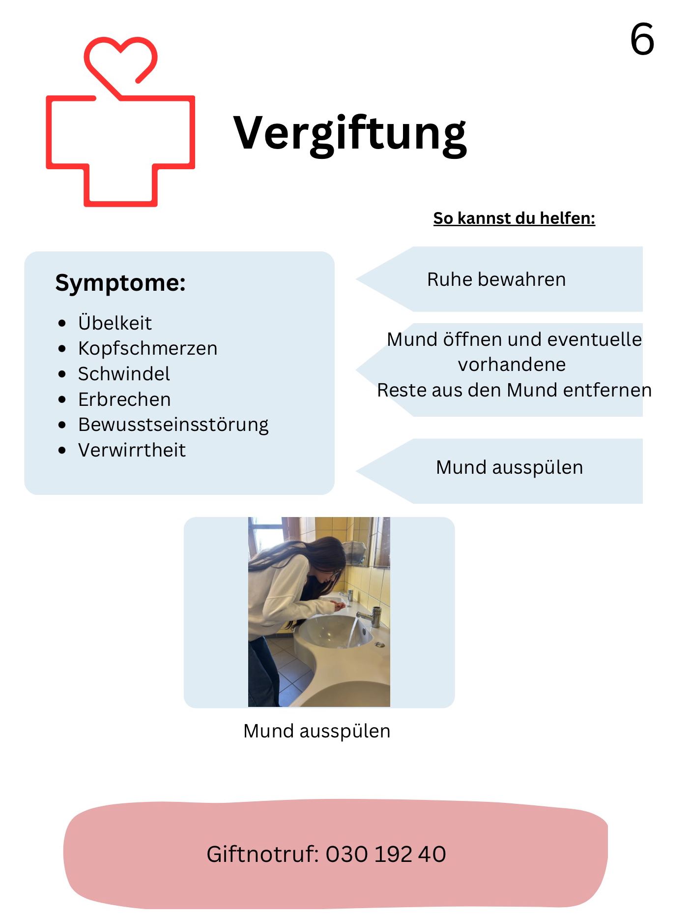 Im Fokus standen typische Notfälle, die im Schulalltag auftreten können. Auf informativen und übersichtlich gestalteten Kärtchen haben die Projektteilnehmer lebenswichtige Erste-Hilfe-Maßnahmen zu verschiedenen Themen aufbereitet. Dazu gehören:
