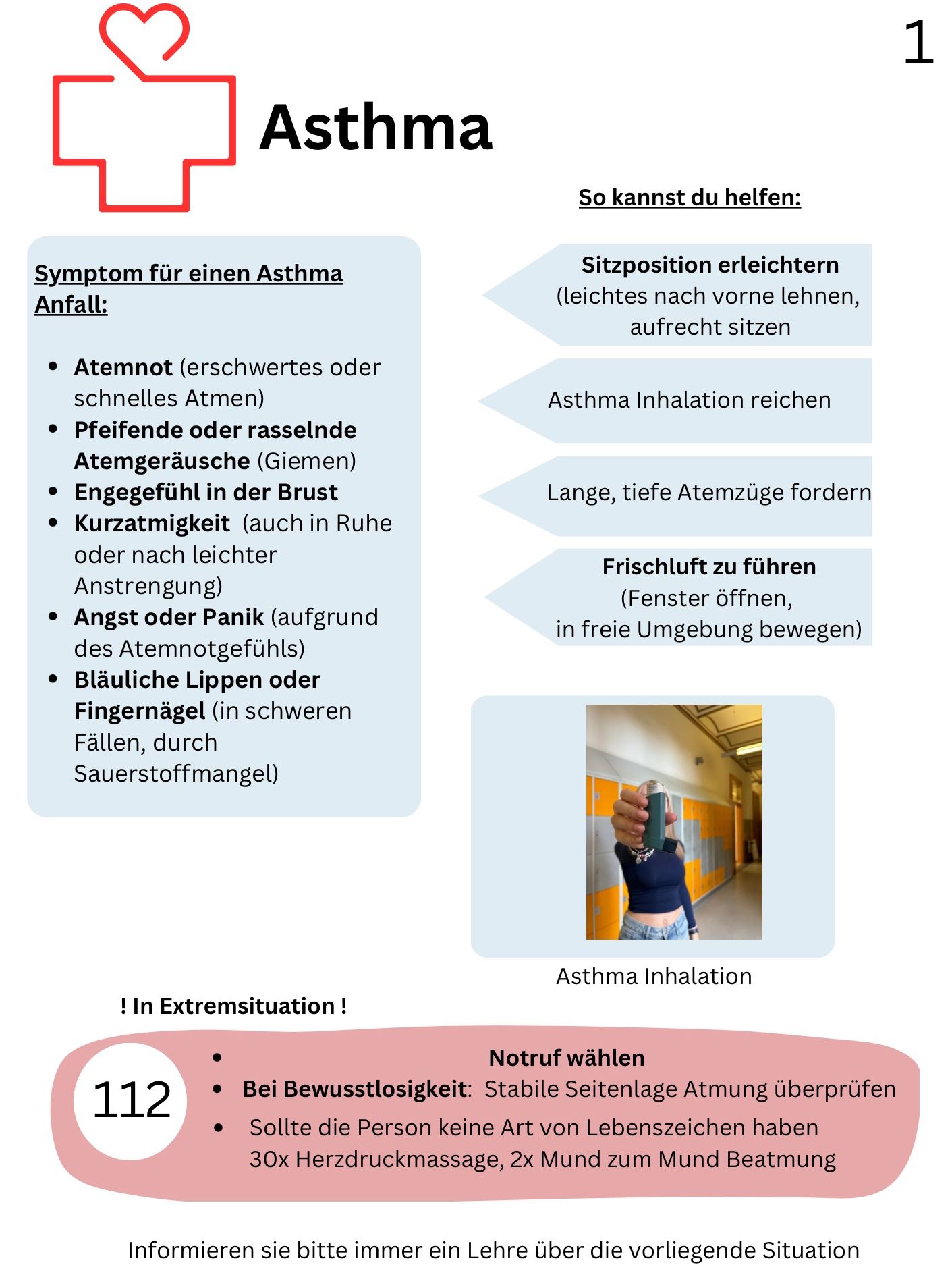 Die Kärtchen sollen nicht nur im Notfall als schneller Wegweiser dienen, sondern auch präventiv zur Aufklärung und Sensibilisierung beitragen. Sie wurden so gestaltet, dass sie für alle verständlich sind – egal ob Schüler, Lehrkraft oder externe Person. Komplexe medizinische Inhalte wurden in klare, handhabbare Handlungsschritte übersetzt.