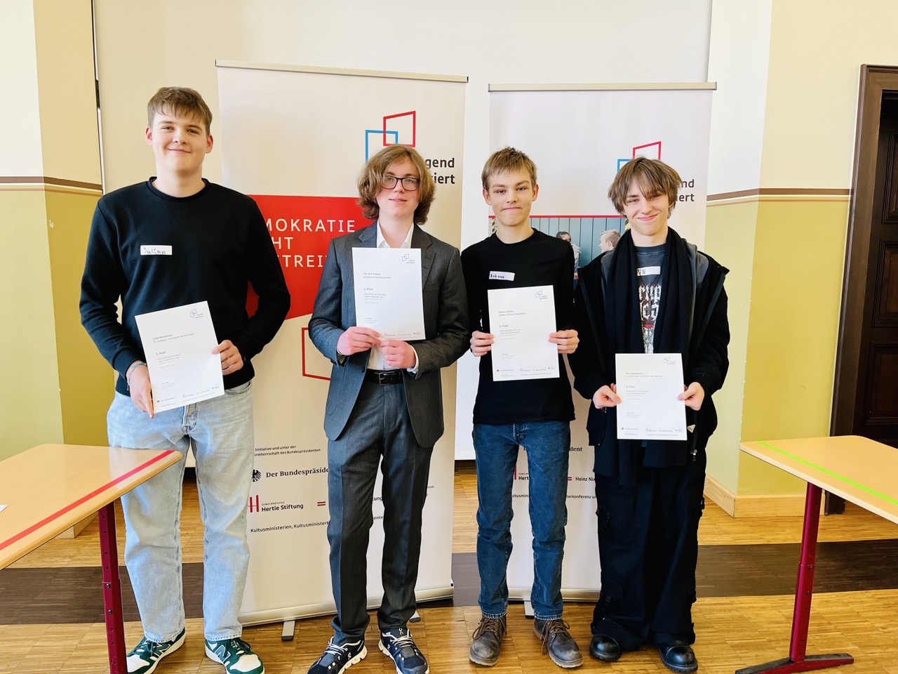 In der Altersklasse II wurden die Themen noch brisanter: Soll Pyrotechnik in Fußballstadien erlaubt sein? Und sollten radikale Parteien von Diskussionsrunden ausgeschlossen werden? Die Teilnehmenden zeigten dabei nicht nur ihre argumentativen Fähigkeiten, sondern bewiesen auch ein Gespür für die politische Tragweite ihrer Diskussionen.