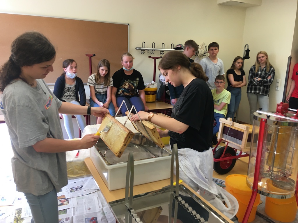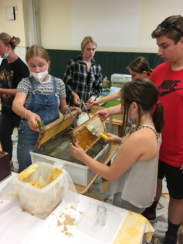 In der ersten Woche der zurückliegenden Sommerferien konnten Schülerinnen und Schüler unserer Schulimkerei gemeinsam mit Herrn Wiemer und Herrn Schmidt Honigwaben entdeckeln, den Wassergehalt des Honigs bestimmen, den Honig aus den Waben schleudern, und in etikettierte Gläser abfüllen. Unterstützt wurde die Gruppe von unseren ehemaligen Schülerinnen Michelle Sandow und Aliya Bauer. Ein großes Dankeschön an alle Beteiligten an dieser Stelle. Natürlich konnte der Honig auch verkostet werden. Er schmeckt wie immer unglaublich lecker. Am Montag, den 27.09. und am Dienstag, den 28.09. wird der frische Honig im Eingangsbereich der KGS Gotha direkt vor den Elternabenden zum Verkauf angeboten.