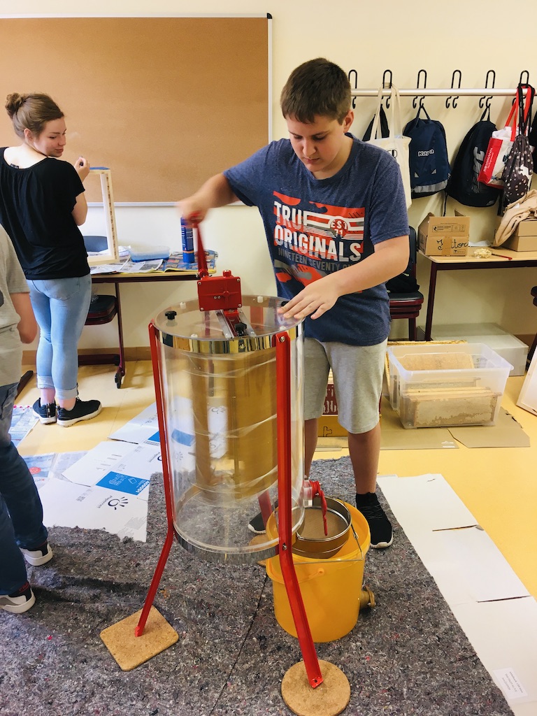 Am ersten Ferientag war es soweit, zusammen mit Michelle Sandow, Aliya Bauer, Daniel Radayev, Constantin Gabriel, Eric Messerschmidt und Paul Kraußer konnten Herr Wiemer und Herr Schmidt endlich die neue Honigschleuder einweihen. Ein herzliches Dankeschön sei an dieser Stelle an Herrn Seiring gerichtet, der uns bei diesem Vorhaben unterstützt hat. Gemeinsam haben wir Honigwaben entdeckelt, den Wassergehalt im Honig bestimmt, den Honig aus den Waben geschleudert, in Gläser abgefüllt und diese etikettiert. Natürlich wurde der Honig auch verkostet. Er schmeckt super lecker. Aber davon sollte man sich lieber selbst überzeugen. Die AG „BEE Ernst“ informiert rechtzeitig über den Verkauf des Honigs.