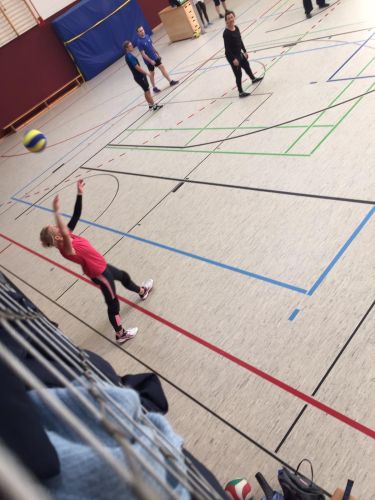 Nach der fünften Stunde ging es in unserer Turnhalle los. Die Sportler erwarteten die Aufbauten für ein Volleyballspiel und für vier Felder Badminton. Nach der kurzen Eröffnung und der Verteilung auf vier Staffeln starteten die ersten Partien auf den Feldern. Auf dem Volleyballfeld begann die spannende Begegnung zwischen dem Schüler- und dem Lehrerteam, das von Frau Bonsack, Frau Krause, Frau Wollenhaupt, Herrn Kath, Herrn Skaba und Herrn Stephan gestellt wurde. Der 3:0-Sieg der Lehrer ließ die Stimmung bei den Schülern noch lange nicht sinken, sodass nach kurzer Verschnaufpause in durchmischter Besetzung fleißig weitergespielt wurde.