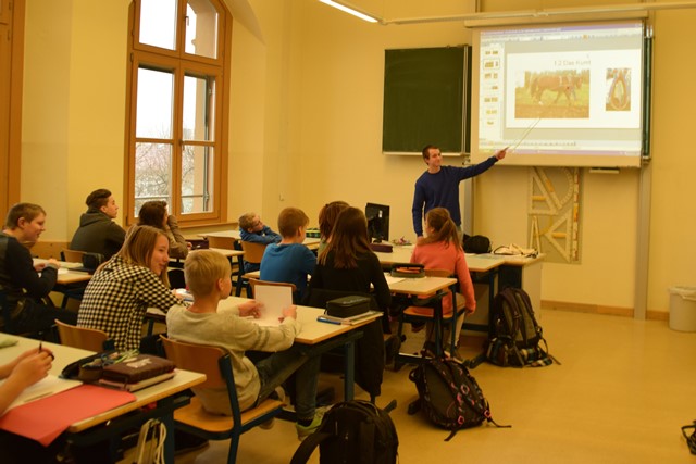 Die 7d beschäftigt sich im Rahmen einer Stationsarbeit mit dem Leben der Bauern im Mittelalter. Valentins Vortrag veranschaulichte die Arbeit der Bauern mit Pferd und Pflug, des Weiteren erklärte er die Dreifelderwirtschaft.