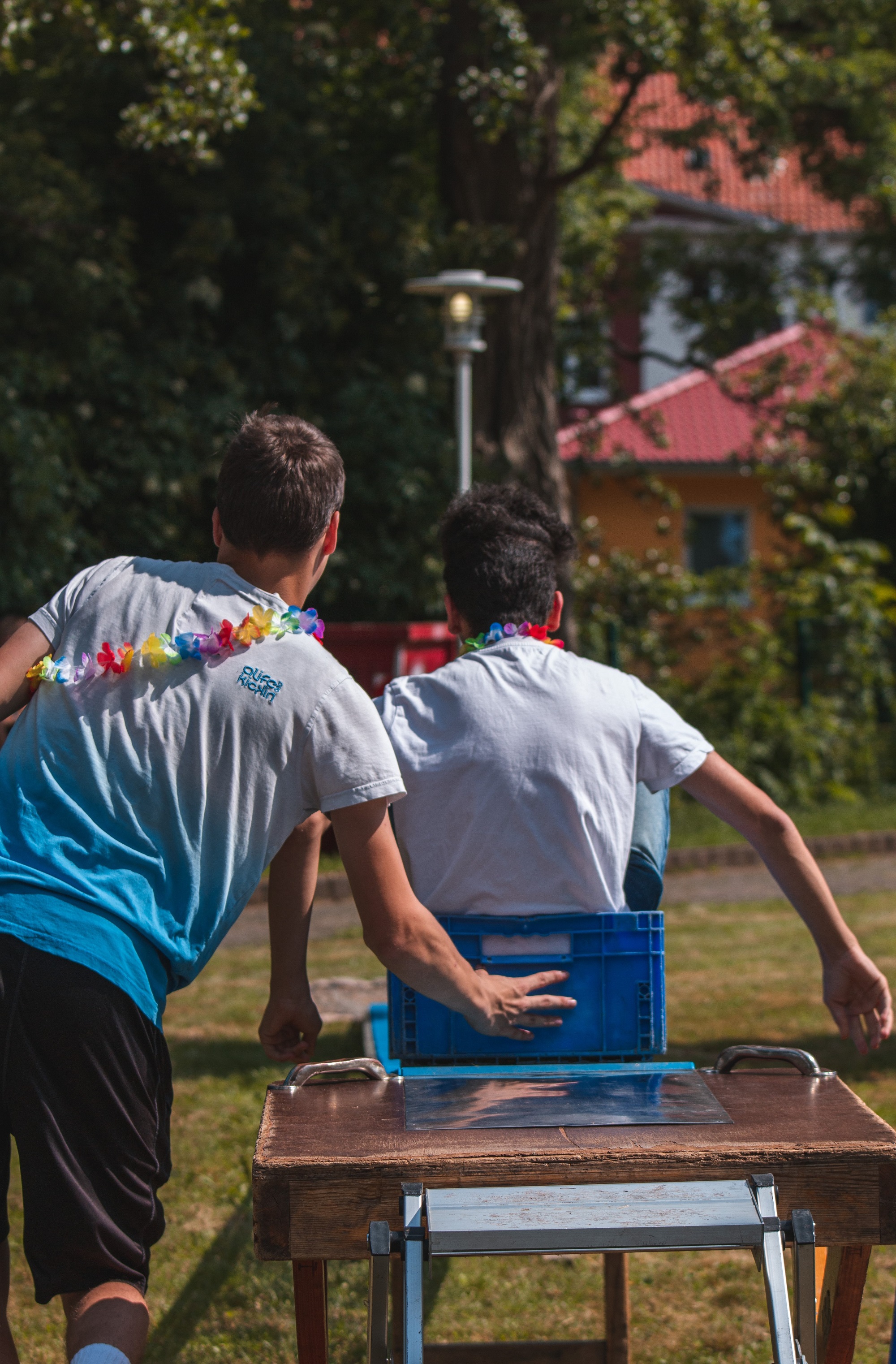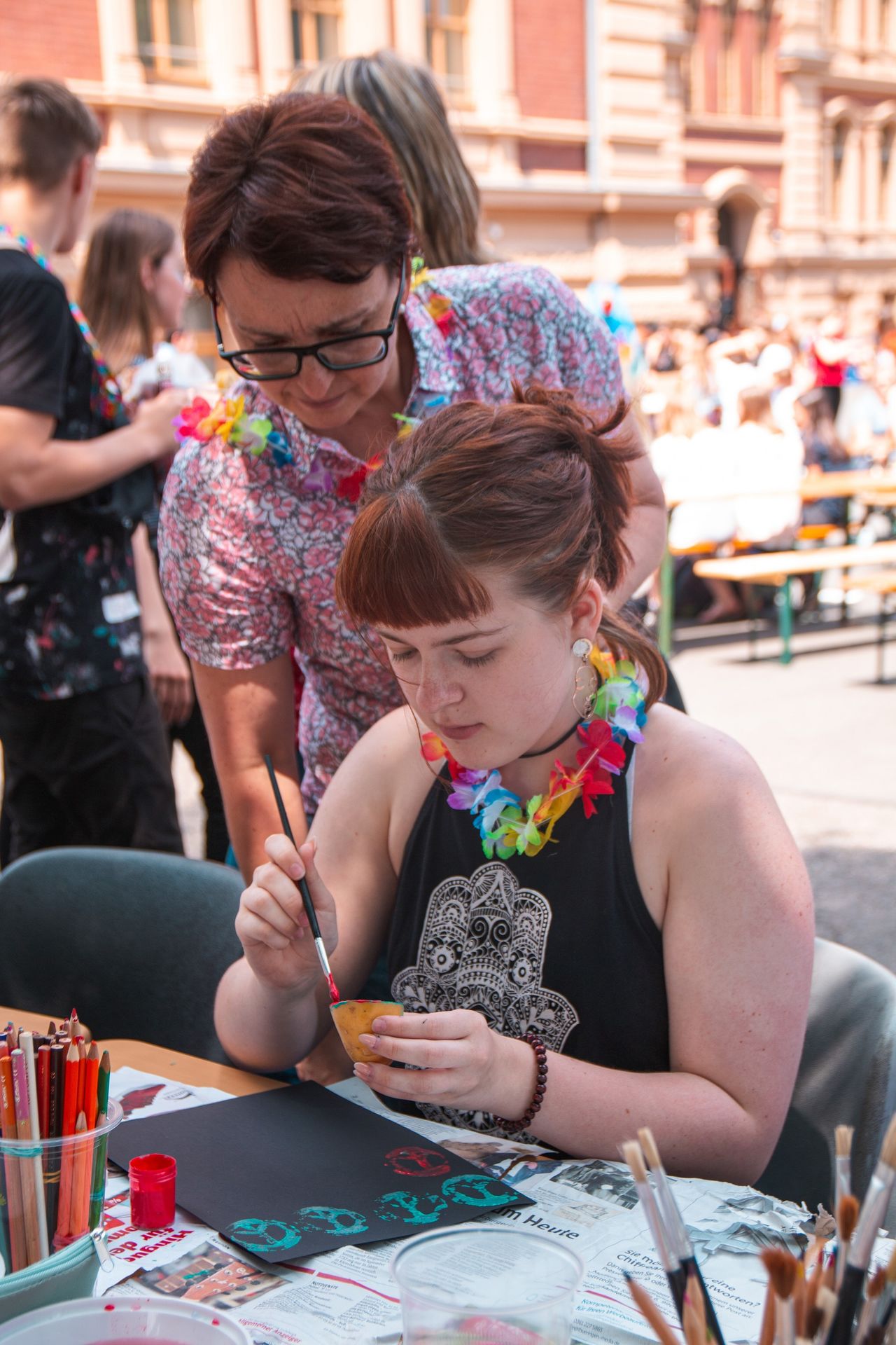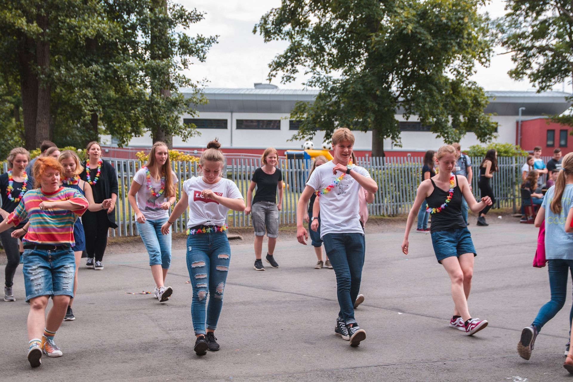 Bunt und voller Menschen war der Schulhof der Kooperativen Gesamtschule „Herzog Ernst“ am sonnigen Freitagnachmittag. Schüler, Eltern und Gäste feierten ihr erstes gemeinsames Sommerfest. Einem Aufruf der Schülerversammlung folgend, stellten die Klassen ein großes Aufgebot an eigenen Ständen auf die Beine. Einfach der Nase nach fand man alles, was zu einem gelungenen Nachmittag beitragen kann: Bratwürste, Burger, Hot Dogs, selbstgebackener Kuchen und Kekse sowie gesunde Obstspieße, außerdem zur Erfrischung Cocktails und kalte Getränke. Auch die Unterhaltung kam nicht zu kurz: Dosenwerfen, ein Flohmarkt, eine Tombola und Kinderschminken wurden angeboten. Jede konnte seinen eigenen Button gestalten und sich als Graffitikünstler ausprobieren. Auf dem an den Schulhof angrenzenden Gelände hatte der Kreisjugendring zwei Hüpfburgen, eine Rollenrutsche und einen Bungeerun aufgebaut. Mitten im bunten Treiben überraschte ein Flashmob, initiiert von den Oberstufenschülern, zu bekannten Partyklassikern. Nach dem Essen und der sportlichen Betätigung konnte man sich bei guten Gesprächen auf dem Schulhof erholen.