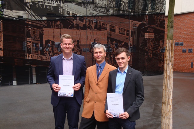 Herzlichen Glückwunsch für unsere Schüler Eric Kieling und Maximilian Schmieder zu einer tollen Anerkennung! Die beiden recherchierten zu einem tragischen historischen Ereignis in unserer Umgebung aus dem Jahr 1920. Unter dem Titel "Die Morde von Mechterstädt" trugen sie Materialien zu der Bluttat an 15 Thaler Arbeitern durch rechte Marburger Korpsstudenten zusammen und bereiteten diese für Schüler auf. Für ihre Leistung wurden Eric und Maximilian beim 11. Schülerwettbewerb der Stiftung Ettersberg am 24. Juni 2014 in der Gedenkstätte Andreasstraße in Erfurt von der aus namhaften Professoren, Journalisten und Pädagogen bestehenden Jury mit einem Sonderpreis geehrt.