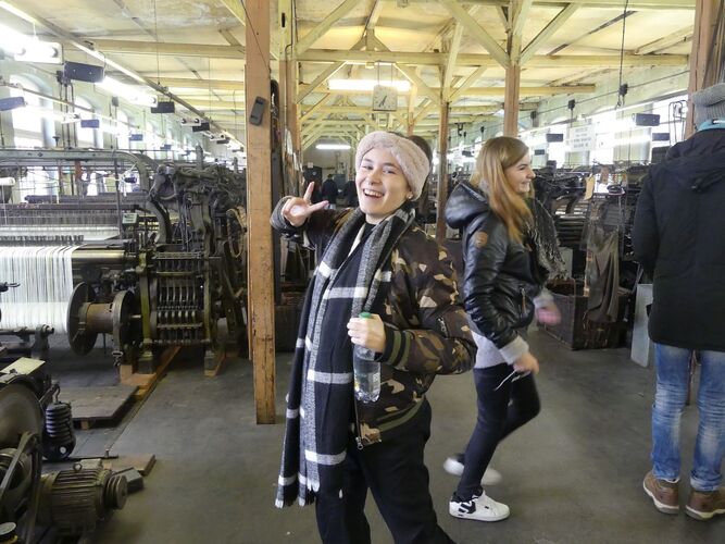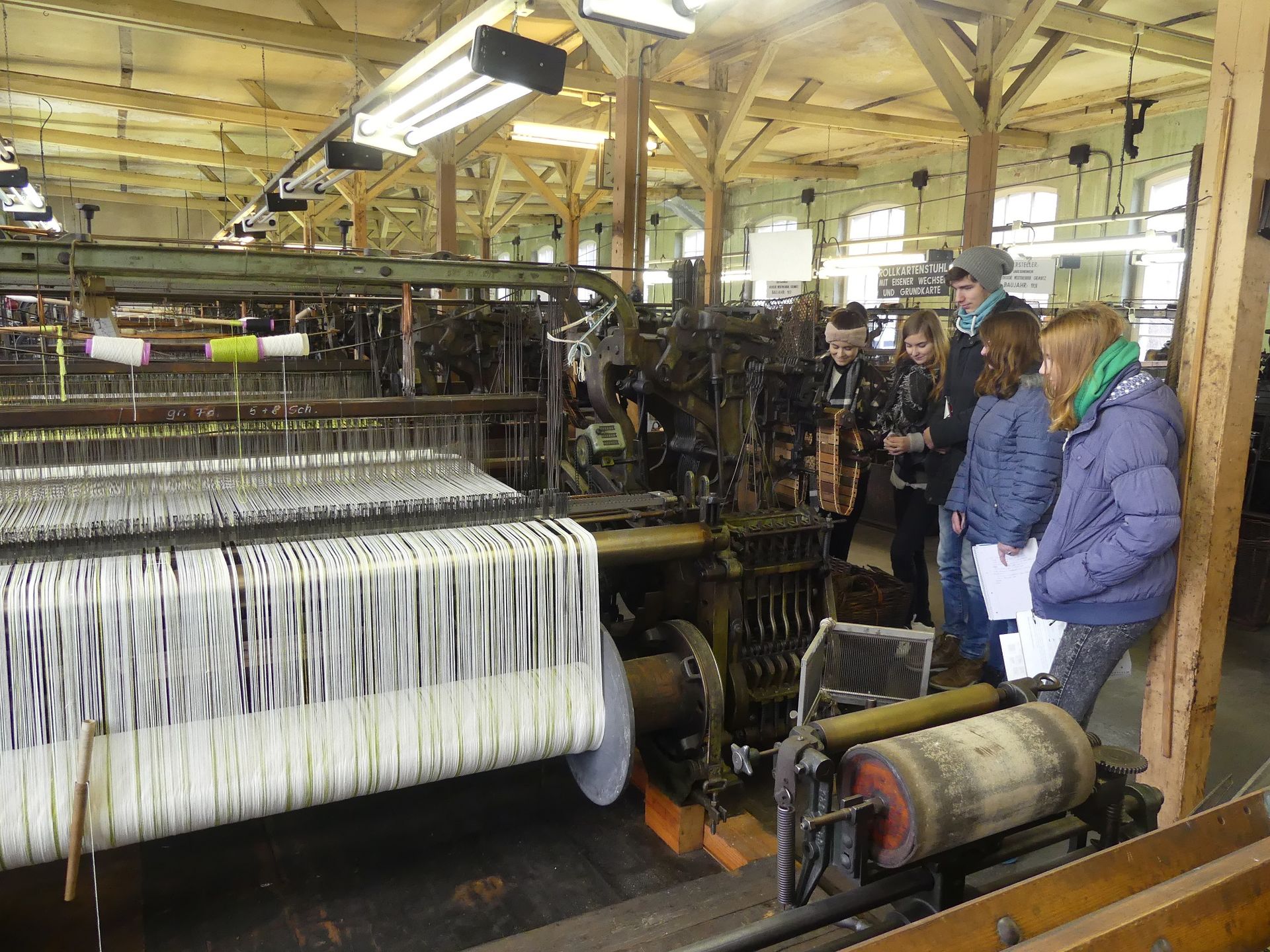 Das Museum in der ehemaligen Tuchfabrik Gebr. Pfau ist ein wahres industriegeschichtliches Schmuckstück und einmalig in Mitteleuropa. Aliya Bauer staunte: „Hier kann man den kompletten Produktionsablauf der Textilherstellung nachvollziehen – Flocken, Krempeln, Spinnen, Zwirnen, Weben, Färben, Walken, Scheren – und vor allem aber die Maschinen in Funktion sehen.“ Letzteres beeindruckte Anne Steinborn besonders: „Der Rhythmus der Maschinen und der Geruch haben etwas Spezielles und Ästhetisches. Man muss für dieses Empfinden aber das Wissen über die katastrophalen Arbeitsbedingungen ausblenden.“ Lange Arbeitszeiten und Kinderarbeit waren früher normal. Außer den Informationen über die Arbeitsprozesse, über die sozialen Verhältnisse und über die Umweltfolgen der Textilproduktion erfuhren die Schüler nebenbei viele kleine Details und Anekdoten: 1903/04 fand in Crimmitschau der größte und längste Streik im Kaiserreich statt. 8000 Menschen waren dabei 22 Wochen im Ausstand. Die Staatsmacht ging mit aller Härte gegen sie vor. Wie aber konnte sie z. B. auf legalem Wege Streikposten vor den betroffenen Betrieben verbieten? Museumspädagogin Marion Kaiser verriet: Man erklärte sie einfach zu Verkehrshindernissen,