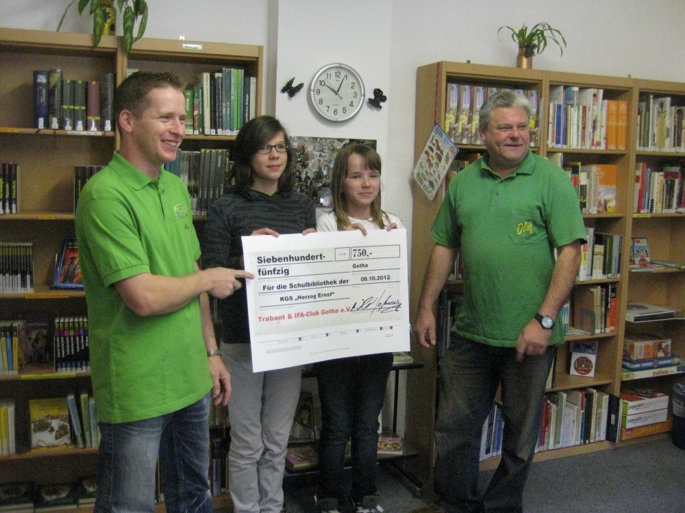 750 Euro sind während des Treffens unter anderem durch eine Tombola und weitere Spendenaktionen zusammen gekommen, sie wurden nun am Montag, den 8. Oktober 2012 um 10.00 Uhr in der Schulbibliothek der KGS "Herzog Ernst" in Gotha von Mitgliedern des Vereinsvorstandes übergeben. "Wir haben uns für die Schulbibliothek entschieden, weil dort mit großem Engagement seit Jahren eine herausragende Arbeit gemacht wird", so Alexander Kern, Mitglied des Vorstands des Trabant- und IFA-Clubs.