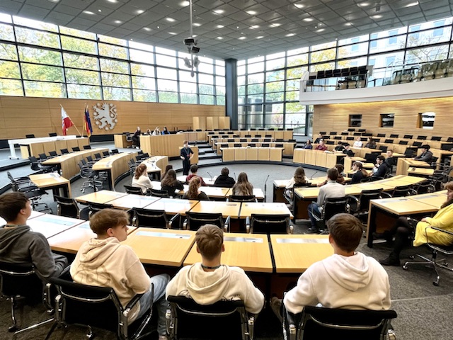 Bei einer Führung durch die Landtagsgebäude und nach einem Besuch des Plenarsaals konnten die Schülerinnen und Schüler zunächst allgemeine Fragen rund um die Organisation des Landtages und die Arbeitsweise eines Abgeordneten stellen. Im Fraktionssaal, einem Ort, den nur selten Besucher besichtigen dürfen, stellte sich Denny Möller dann auch den kleinen und großen Fragen der Schülerinnen und Schüler. Wie gelingt ein Umdenken bei Thema Klimaschutz? Warum haben viele Schulen in Thüringen einen Lehrermangel? Warum steigen die Preise im Supermarkt und was macht die Politik dagegen? Wie beeinflusst uns der aktuelle Konflikt im Nahen Osten und wie soll sich Deutschland hier positionieren?
