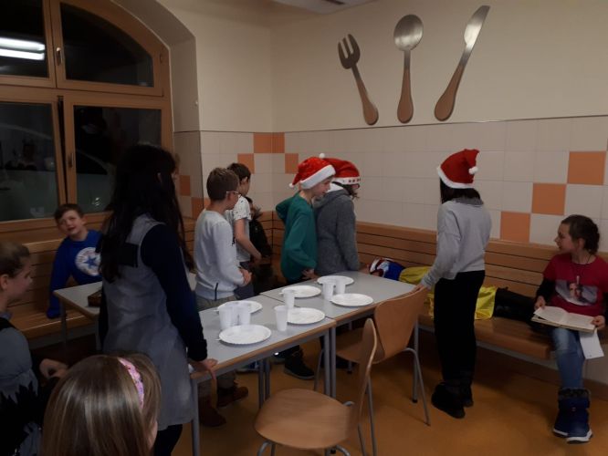 Nachdem wir gebastelt und gebacken haben, führten wir gemeinsam mit unseren Eltern und Lehrern die Weihnachtsfeier durch. Ein Schüler unserer Klasse war der Weihnachtsmann und verteilte die Wichtelgeschenke, die jeder von uns für einen Mitschüler mitgebracht hatte.