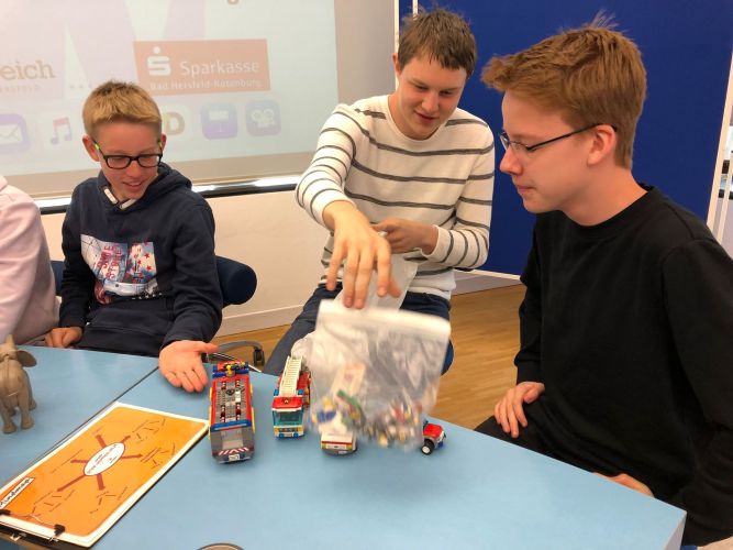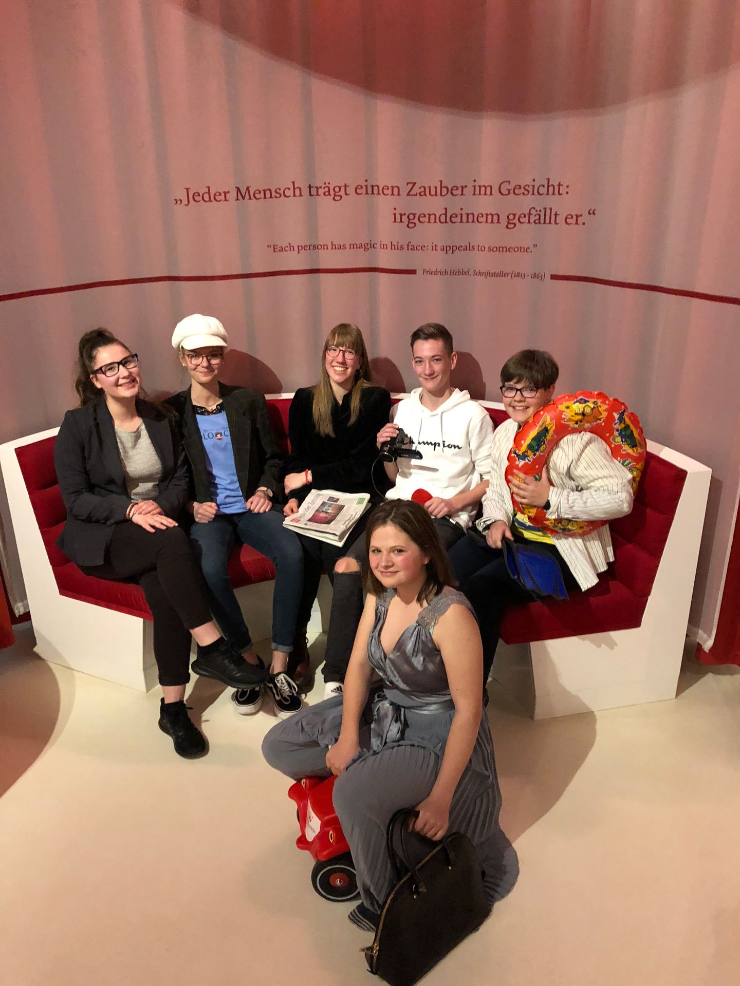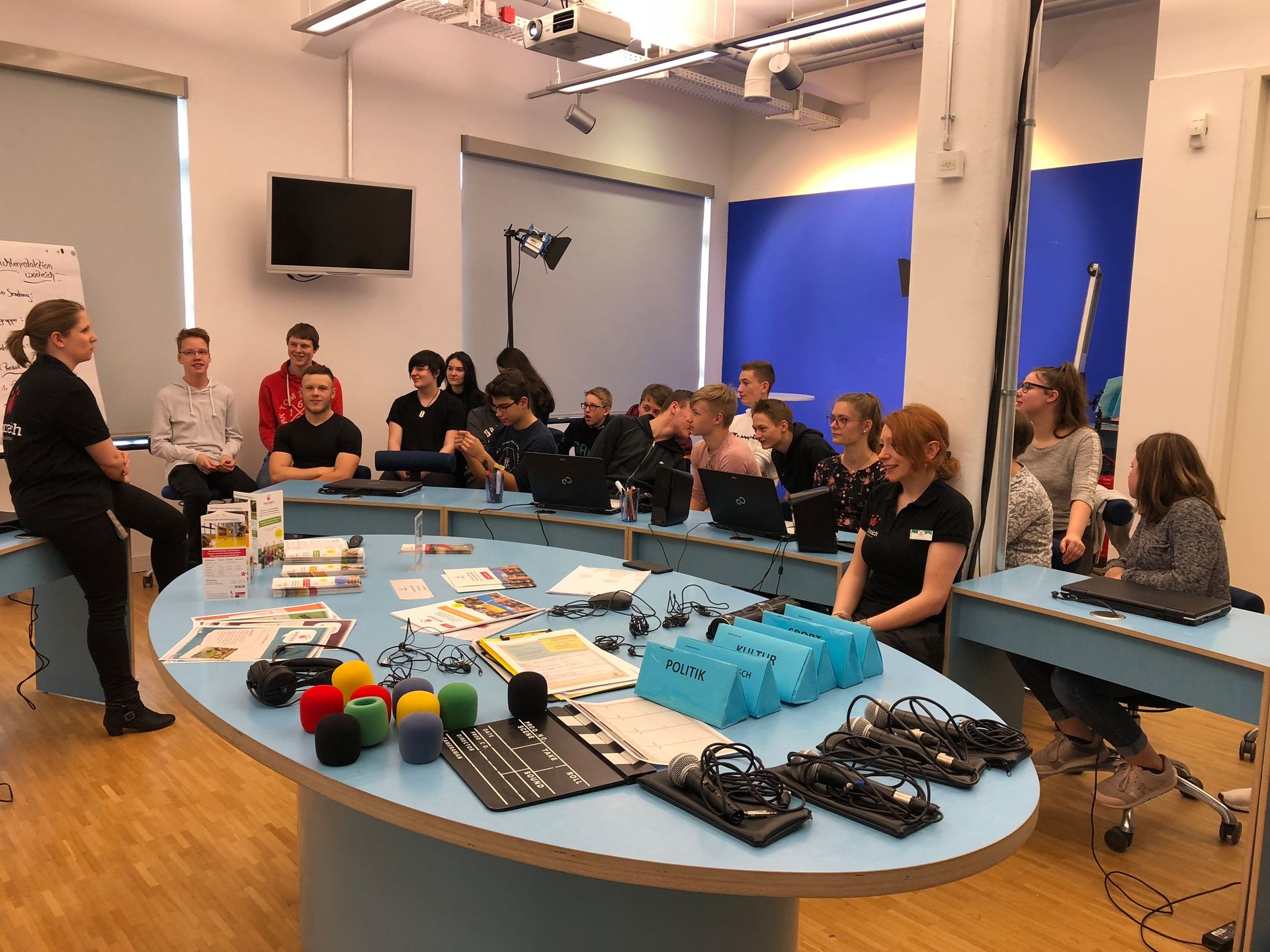 „Thüringer Teenie TV“ lautet der Titel einer Nachrichtensendung, die von Schülern der Klasse 9d am 28.März 2019 in einem Workshop im „Wortreich“ in Bad Hersfeld aufgenommen wurde. Unter Anleitung zweier Mitarbeiterinnen des interaktiven Museums der deutschen Sprache entstand ein 15-minütiger Film, der von Carolin und Mara moderiert und in kleinen Gruppen an verschiedenen Schauplätzen im Museum gedreht wurde. Im Vorfeld erarbeiteten die Schüler innerhalb der Rubriken Sport, Politik, Gesellschaft sowie Klatsch und Tratsch ihre Ideen und ein entsprechendes Storyboard. Mit Mikrofon und Kamera sowie verschiedenen Requisiten gingen die Schüler an die Dreharbeiten für einen jeweils dreiminütigen Beitrag. Es ging um Artikel 13, Mopedverbot für Minderjährige, Extreme Bobbycar Racing und die imaginäre Promifamilie de Raasch. Während die einzelnen Schüler drehten, nahmen die beiden Moderatorinnen ihre Ansagen vor einem Bluescreen im Studio auf. Am Ende der Veranstaltung wurde die zusammengefügte Sendung allen Schülern gezeigt und auf elektronischem Weg zur Verfügung gestellt. Unverkennbar ist dabei die Thüringer Herkunft der Darsteller, überraschend das ein oder andere bislang unentdeckte schauspielerische und kreative Talent.