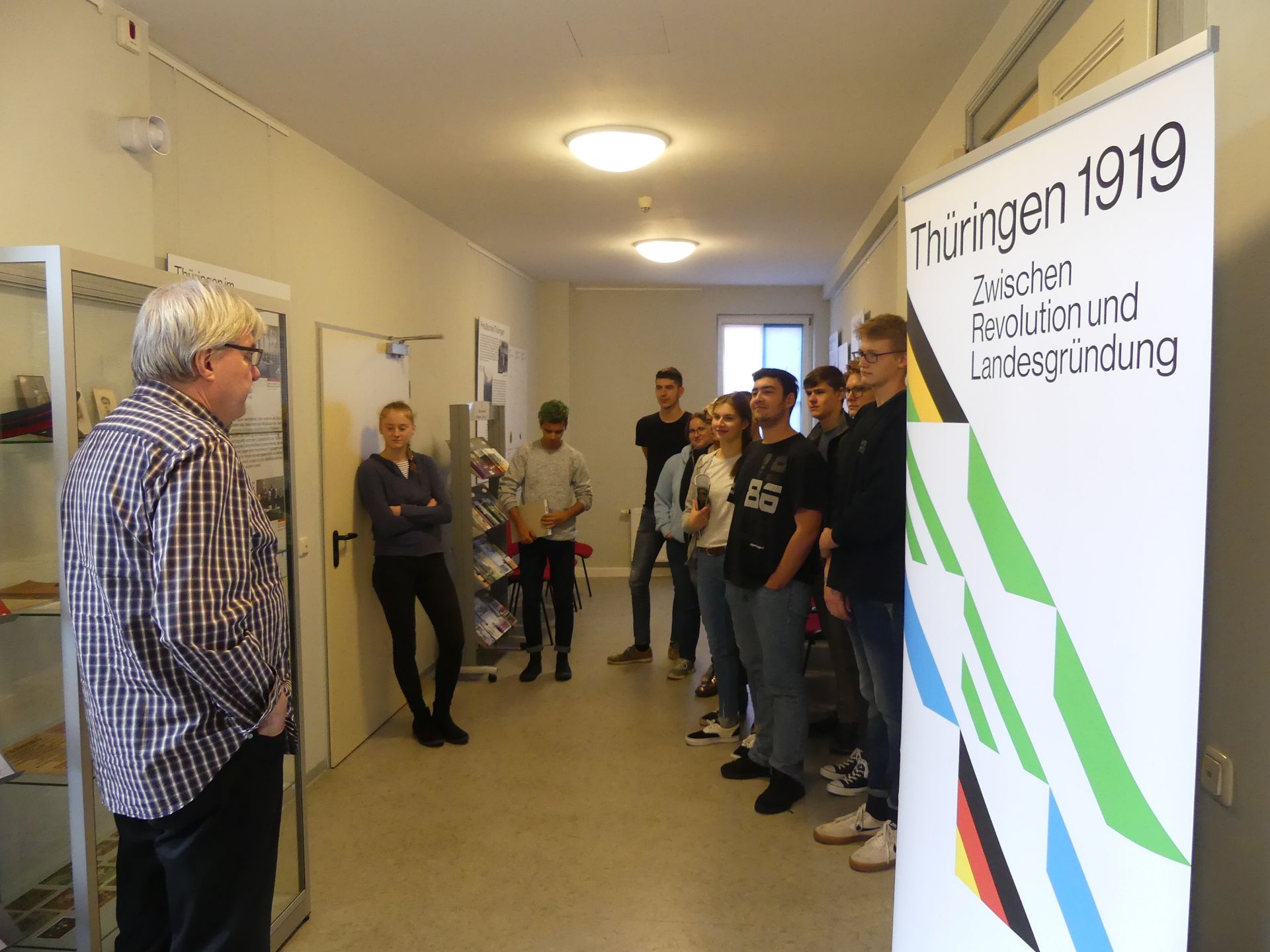 Eine Gelegenheit zur intensiven Beschäftigung mit der Entstehung und Entwicklung unseres Bundeslandes bot sich für den eA-Kurs Geschichte 12 durch den Besuch der Sonderausstellung „Thüringen 1919“ im Tivoli. Der Gothaer Historiker Matthias Wenzel nahm die Schüler*innen mit auf einen Spaziergang durch den Irrgarten der Thüringer Dynastien. Dabei schlug er den Bogen vom Thüringer Königreich bis hin zu aktuellen und die Zukunft betreffenden Fragen. Anhand der Vielfältigkeit unseres kleinen Bundeslandes wurden nicht nur Besonderheiten dieses Mikrokosmos deutlich, sondern auch viele Spezifika des Makrokosmos der deutschen Geschichte.