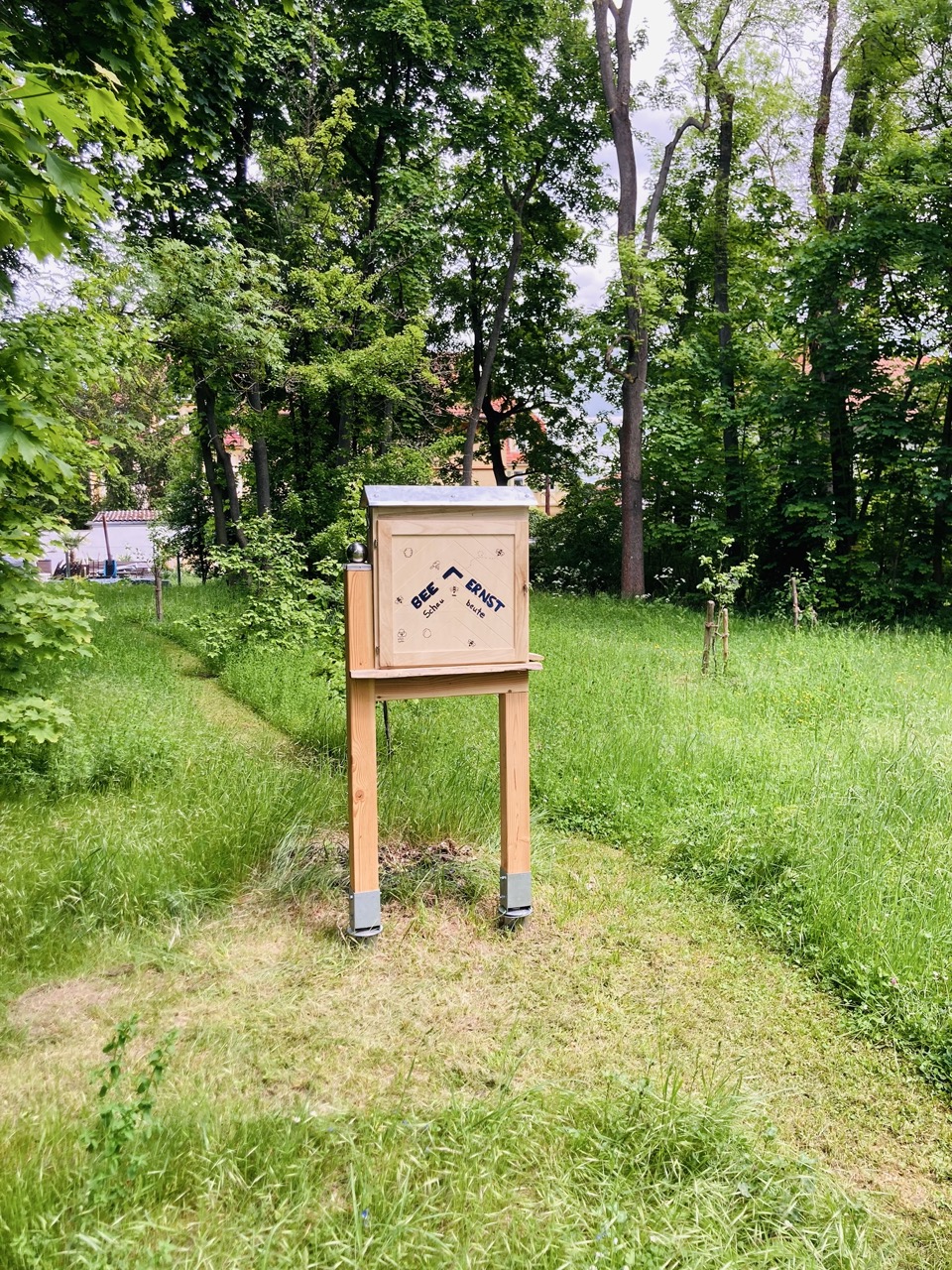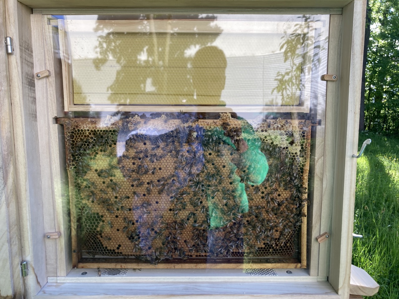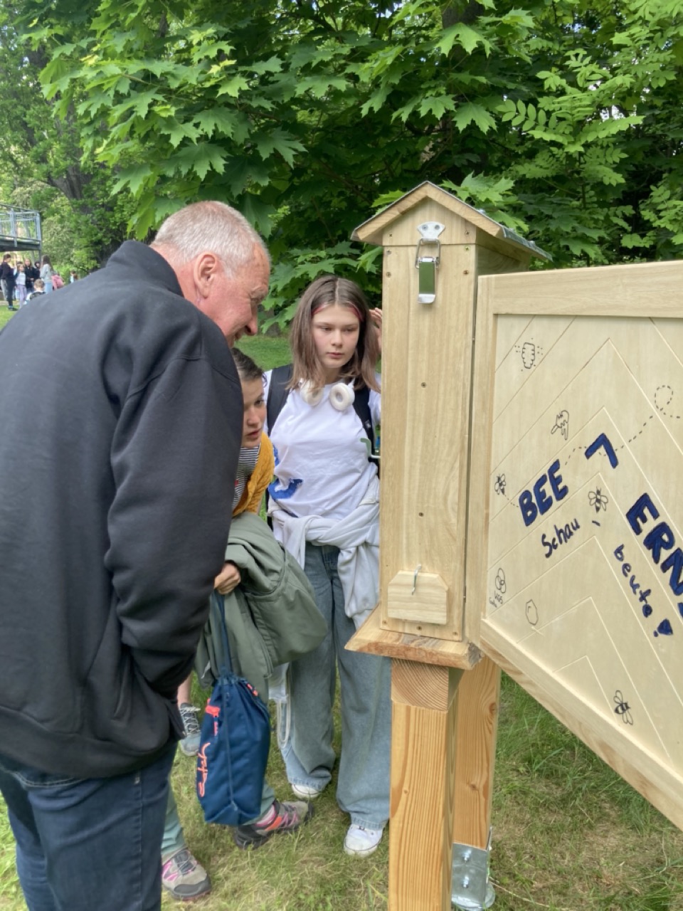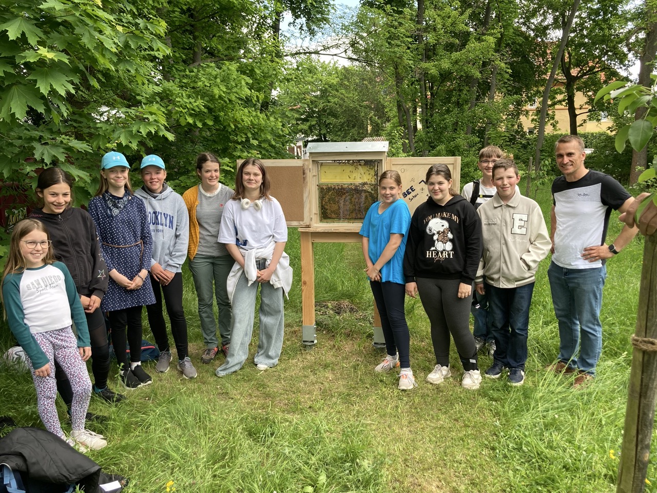 Zum Weltbienentag präsentierten Schülerinnen und Schüler der Imker AG unserer Schule eine Schaubeute am Rand unserer Streuobstwiese. Im letzten Schuljahr hat die Firma Durable aus Gotha der Imker AG 1500 Euro gespendet. Von dem Geld konnten die AG Mitglieder u.a. eine Exkursion ins Bienenmuseum nach Oberweimar finanzieren, eine kleine Drechselmaschine und die Schaubeute kaufen. Kimberly Arlt aus der Klasse 10a hat die Gestaltung der Schaubeute übernommen. Von Mai bis August wird die Schaubeute nun mit Bienen besetzt sein und ermöglicht unseren Schülern einen Einblick in den Bienenstaat. Die Königin lässt sich in diesem Jahr an ihrem blauen Opalith-Plättchen auf dem Rücken leicht finden.