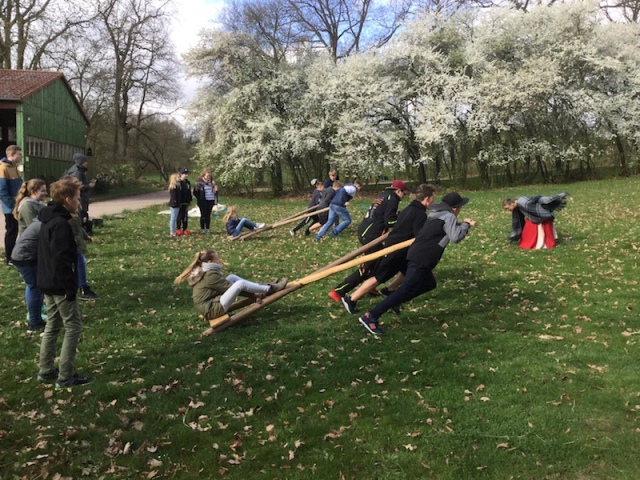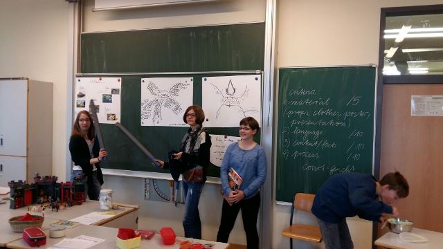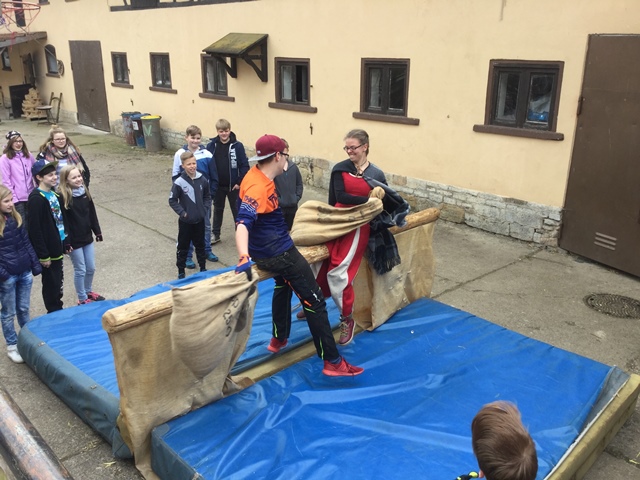 Die diesjährige Projektwoche führte die Klassenstufe 7 zurück ins Mittelalter. Je nach Interessenslage beschäftigten sich die Schülerinnen und Schüler in Kleingruppen mit verschieden Lebensbereichen und Ereignissen aus dieser Zeit. Am Mittwoch, den 5. April, nahmen die rund 120 Schüler Kurs auf die Wartburg, wo nach dem kurzen Aufstieg eine Führung auf dem Plan stand. Bei der Familienkommunität Siloah in Neufrankenroda erwartete die Siebtklässler am Folgetag ein abenteuerliches und aktives Programm. Hier mussten die Teilnehmer in gemischten Gruppen allerlei Aufgaben bewältigen, viele davon konnten nur im Team gelöst werden. Zum Abschluss der Projektwoche präsentierten die einzelnen Gruppen ihre Arbeitsergebnisse.
