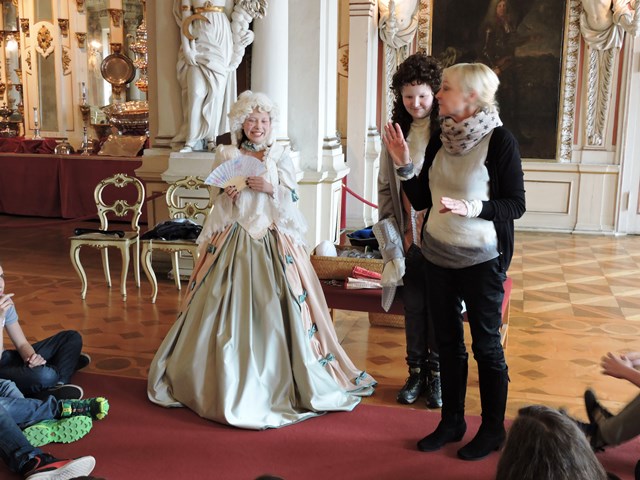 Mit einem freundlichen Schmunzeln betrachteten am vergangenen Mittwoch zahlreiche Gäste das lebhafte Geschehen auf Schloss Friedenstein. Mit viel Herz und Begeisterungsvermögen nahmen die Museumspädagoginnen Heike Faber-Günther und Gabriele Roth die Schülerinnen und Schüler der Klasse 7d der KGS Herzog Ernst mit auf eine Reise in die Zeit des Barock. Den Auftakt bildete der Besuch des Ekhoftheaters. Unter fachkundiger Anleitung von Heike Faber- Günther demonstrierte Aaron Jarosch auf der Bühne seinen Mitschülern im Zuschauerraum, was es heißt, „aus der Versenkung zu kommen“, „ins Rampenlicht zu treten“ und „Lampenfieber zu haben“. Robert Sommer erzeugte mit einer Theatermaschine Windgeräusche, während im Hintergrund mit Holzkugeln grollender Donner imitiert wurde. Die Schüler konnten einen Blick auf die Wellbäume und Umlenkrollen in der Unterbühne werfen und erlebten die Rezitation verschiedener Fassungen des Erlkönigs durch Emma Kurths und Javier Beato- Campano von den „Brettern, die die Welt bedeuten“.