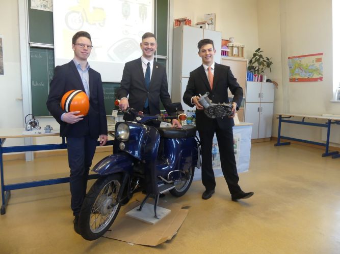 „So ein tolles Kolloquium!“, schwärmte Schulleiterin Marion Kruspe nach der Leistung von Anthony Roth, Paul Schwab und Oliver Wolf. Die drei jungen Männer hatten auf äußerst authentische, anschauliche und fachmännische Weise die Zwei-Takt-Schwalbe mit der neuen Elektro-Schwalbe verglichen. Auch zahlreiche andere Gruppen zogen Mitschüler und Prüfungskommissionen in ihren Bann. Emely Albrecht, Isabel Creutzburg, Victoria Köllner, Clara Matthäi und Doreen Schulz hatten eine Ausstellung zur Rolle der Frau im Spiegel der Mode konzipiert. Ausgehend von einem aktuellen Anlass – 100 Jahre Frauenwahlrecht in Deutschland – nahmen sie ihre Gäste mit auf eine interessante Zeitreise durch das letzte Jahrhundert. Und wenn am Ende des Kolloquiums zum Thema Palliativpflege sowohl die Gäste als auch der präsentierende Schüler bedauern, dass die Veranstaltung zu Ende ist, zeigt dies, dass man sich vor Prüfungen nicht fürchten muss. Die Vielfalt der Themen von Exoplaneten über Photovoltaik, Live Action Role Playing, einem Vergleich von Zeichentrickneuverfilmungen mit den Erstumsetzungen, … bis hin zu Fakte News beweist, dass sich den Schülern mit dem Seminarfach viele Möglichkeiten bieten, auch in der Schule ihre eigenen Interessen vertieft zu betrachten. Die Schwalbe-Gruppe z.B. ist dafür der beste Beweis.