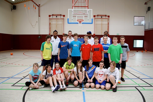 15 Schüler und Schülerinnen der 8. Klassen entschieden sich dafür und lernten in diesen 5 Tagen verschiedene Seiten dieses Sports kennen. Bereits am Montag kamen die Profispieler der Rockets und arbeiteten mit den Schülern an unterschiedlichen Schwerpunkten. So standen Wurf, Pass, Doppelpass, Dribbling und Rebound auf dem Programm. Vor allem an der Reboundstation ging es heiß her. Hier gab es die ersten kleineren Blessuren. So erlebten alle, wie hart der Kampf um den Ball unter den Körben ist.