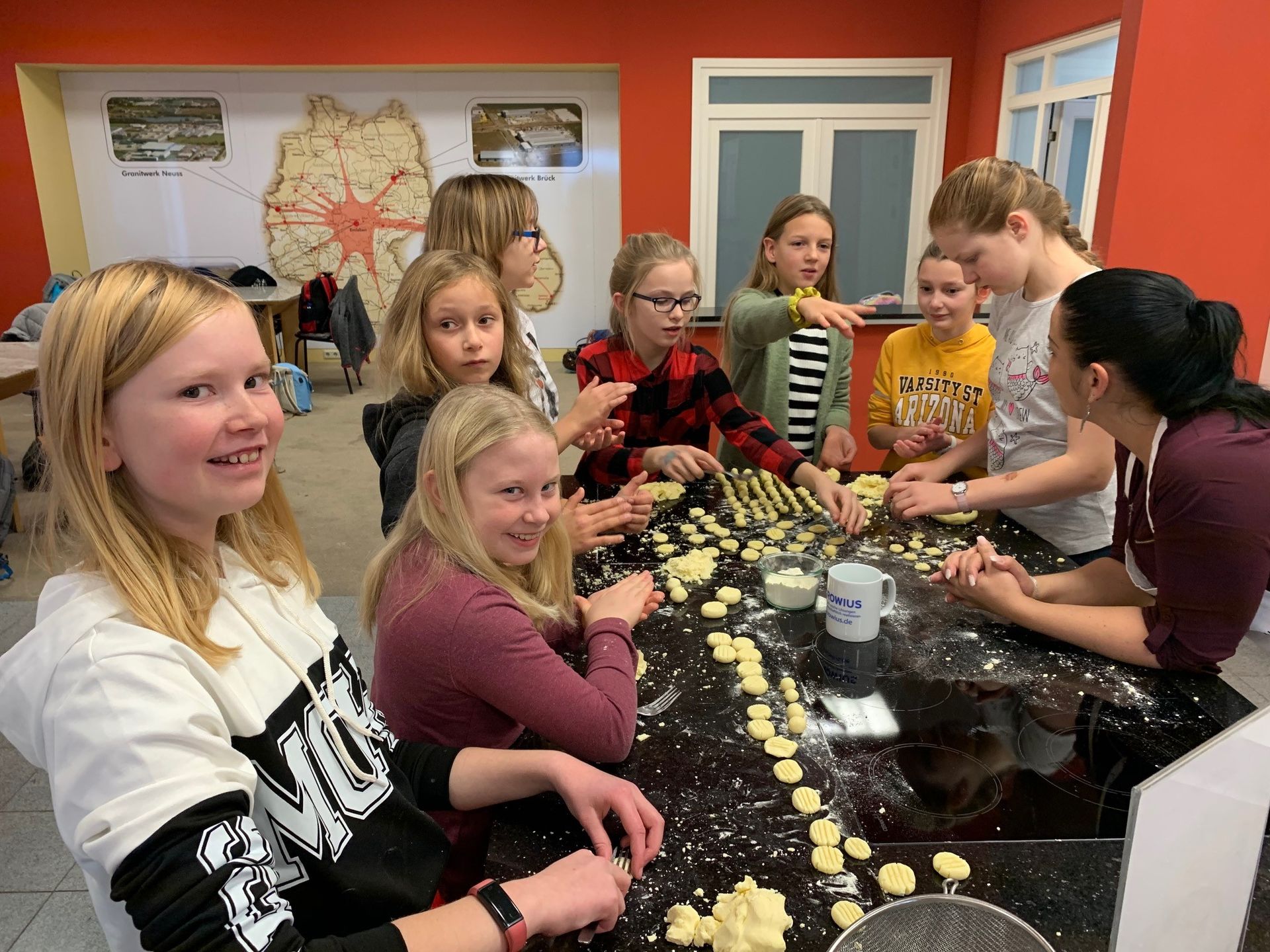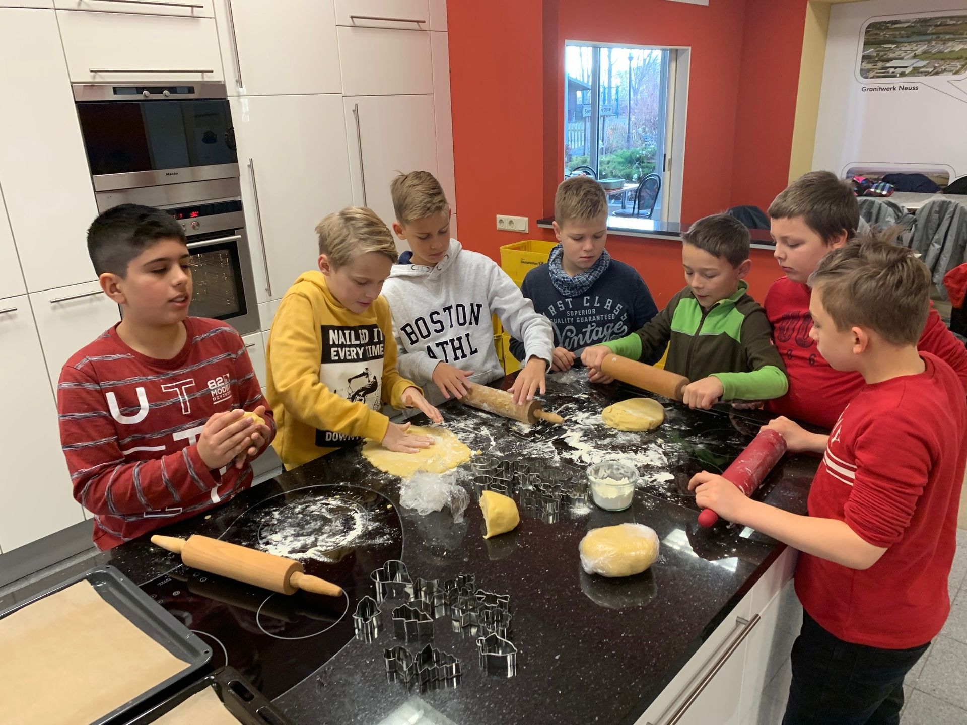 Nach ca. 20 Minuten Fahrt erreichten wir die Haltestelle in Emleben. Danach gingen wir noch ein Stück zu Fuß und kamen gut gelaunt an unserem Ziel, dem Küchenstudio Marquardt, an. Die Betreuerinnen (Victoria, Maria und Kerstin) stellten sich kurz vor und wir wurden in vier kleinere Gruppen eingeteilt. Eine Gruppe stach Plätzchen aus, die anderen formten Schneeflocken, Engelsaugen und Vanillekipferl.