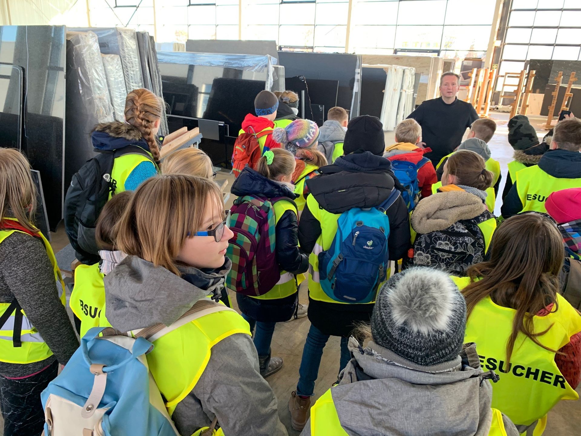 Nachdem wir alle Plätzchen untereinander aufgeteilt hatten, durften wir noch eine Werksführung von Herrn Jakobs genießen. Zuerst zeigte er uns die Halle, in der die „rohen“ Granitplatten gelagert und für die Weiterverarbeitung vorbereitet werden. Anschließend ging es in die Halle, in der die Granitplatten geschnitten, geschliffen und zusammengeklebt werden. Zum Schluss zeigte uns Herr Jakobs dann noch, wo die Platten poliert und auf ihre Qualität getestet werden.