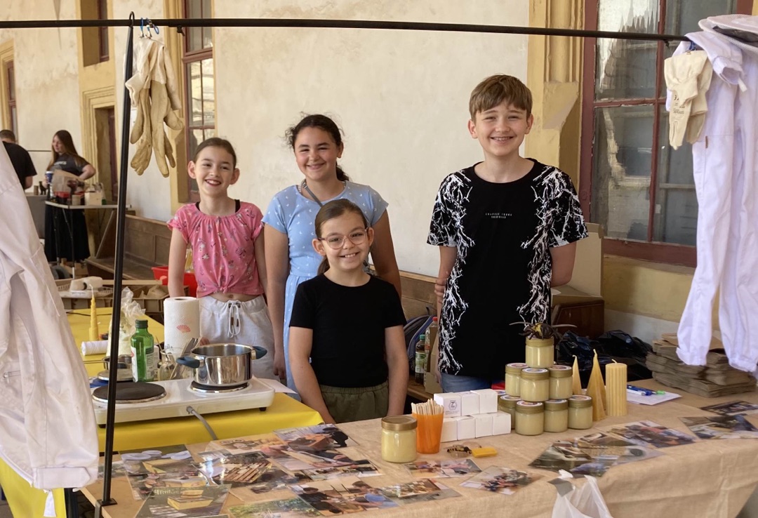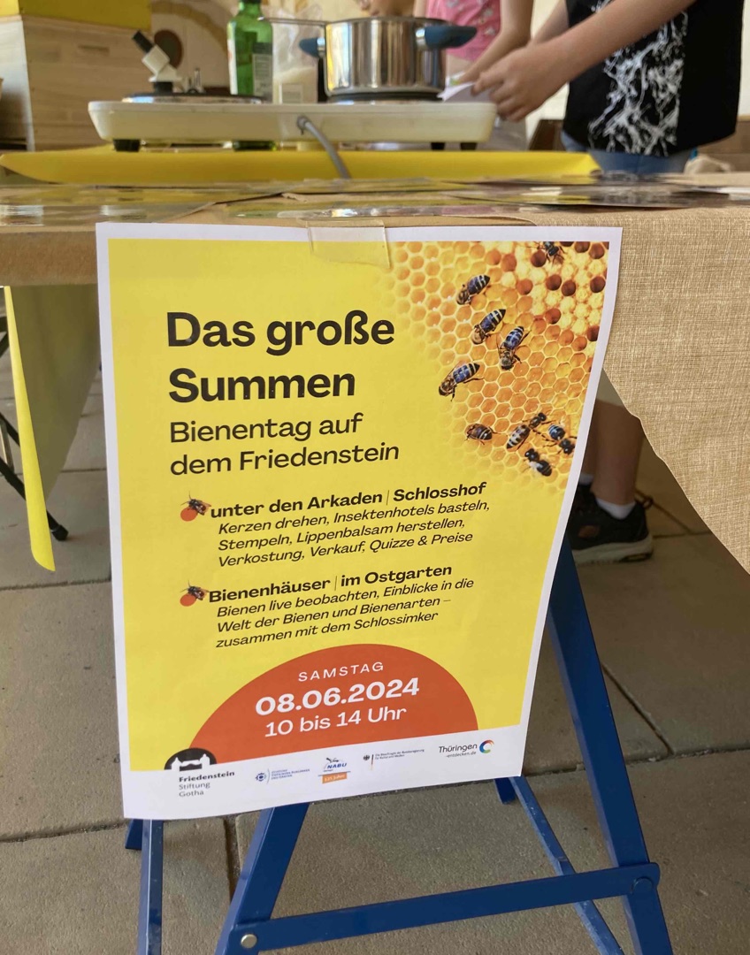 Am 08. Juni hielten Bienen Einzug auf Schloss Friedenstein. Unter den Arkaden des Schlosses präsentierten Johanna König, Sarah Krivna, Lynn Reibstein und Jason Seifahrt die Imker-AG unserer Schule. Interessierte Besucher konnten hier u. a. frischen Honig verkosten, Kerzen drehen oder Lippenbalsam herstellen. Unterstützt wurde der Bienentag durch die Stiftung Thüringer Schlösser und Gärten. Im Rahmen der „Langen Tage der Natur“ möchten der NABU Thüringen und die Stiftung Naturschutz auf die biologische Vielfalt im Freistaat aufmerksam machen und für die kostbaren Naturschätze im Land begeisternt