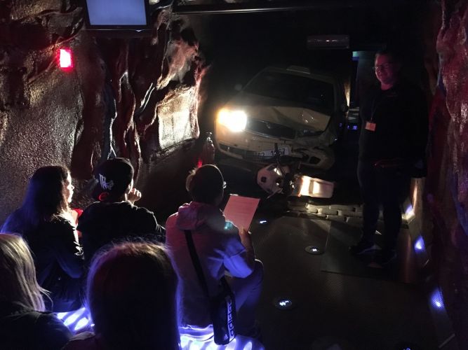 Die Schüler der achten Klassen stiegen am Freitag, 14.09. in die Waggons ein, immer begleitet von einem Klassenlehrer des Jahrgangs sowie Frau Kruspe und Frau Hasler. In Führungen von eineinhalb Stunden wurde ihnen gezeigt, wie schrecklich erbärmlich es in einer Drogenhöhle aussieht, wie schnell es unter Drogeneinfluss zu einem Autounfall kommen kann, sie wurden aber auch in die unangenehme Situation eines Verhörs bei der Polizei versetzt. Auf diese Art und Weise konnten sie die Problematik des Themas viel eindringlicher nachempfinden, als nur im Gespräch.
