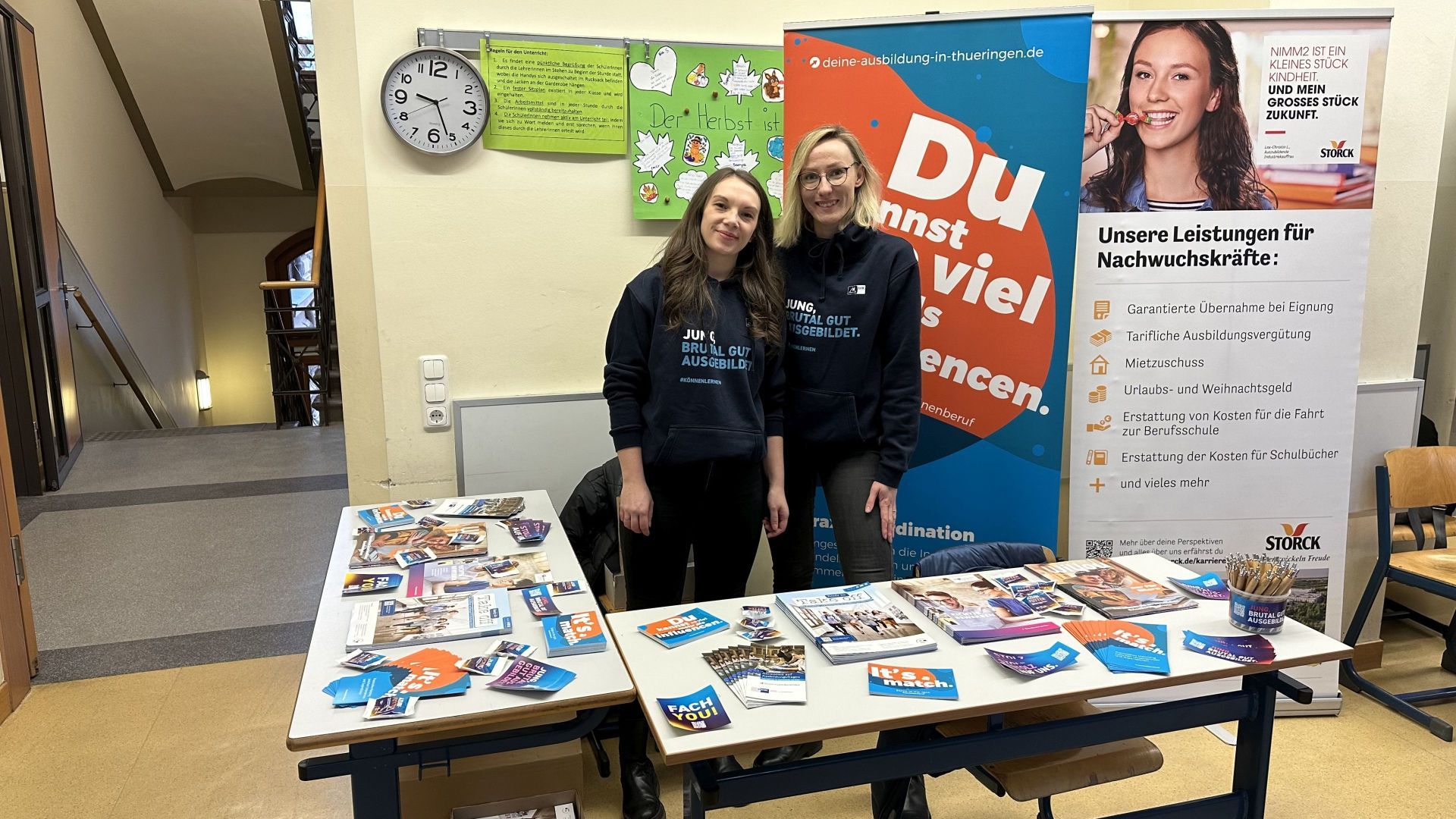 Darüber hinaus wird unsere Schule seit nunmehr einem Jahr durch die Industrie- und Handelskammer Erfurt, im Speziellen von den Praxiskoordinatorinnen Frau Dombrowsky und Frau Küster, begleitet. Diese bieten eine Praktikumsbörse an und unterstützen so die SchülerInnen der neunten Klassen bei der Praktikumssuche, worüber sie an ihrem Stand informierten.